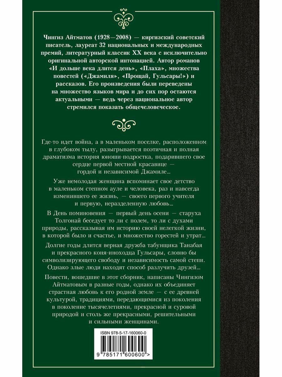 Повести, вошедшие в этот сборник, написаны Чингизом Айтматовым в разные годы, однако их объединяет страстная любовь к его родной земле — с ее древней культурой, традициями, передающимися из поколения в поколение тысячелетиями, прекрасной и суровой природой и столь же прекрасными, решительными и сильными женщинами.