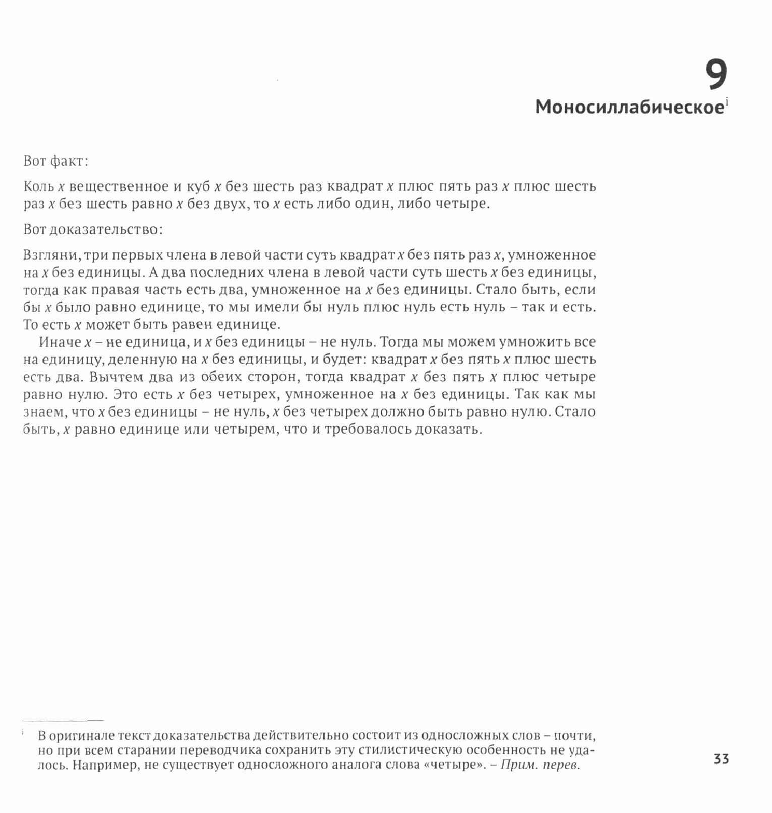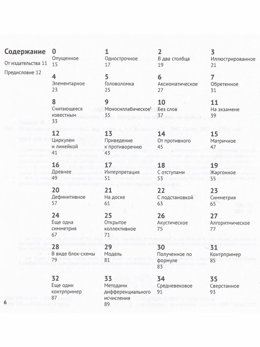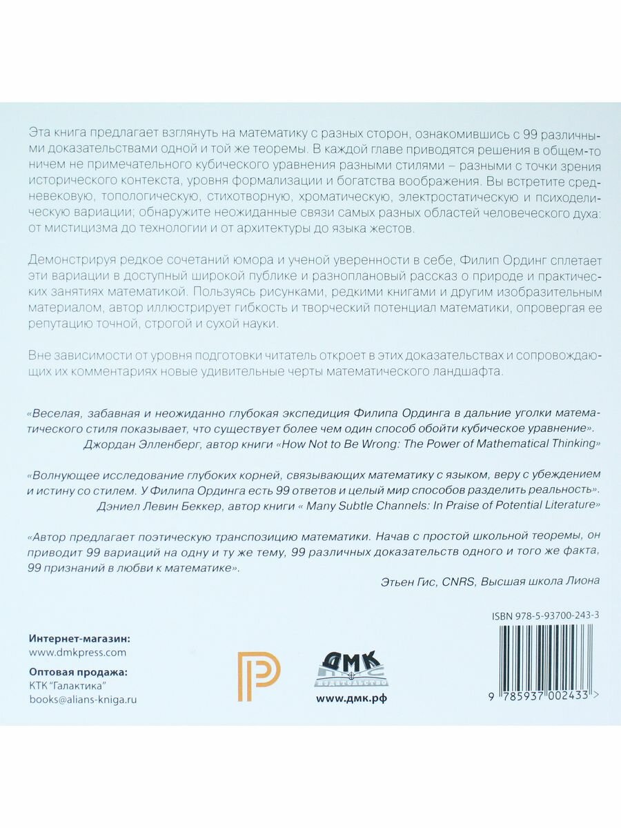 Эта книга предлагает взглянуть на математику с разных сторон, ознакомившись с 99 различными доказательствами одной и той же теоремы. В каждой главе приводятся решения в общем-то ничем не примечательного кубического уравнения разными стилями - разными с точки зрения исторического контекста, уровня формализации и богатства воображения. Вы встретите средневековую, топологическую, стихотворную, хроматическую, электро-статическую и психоделическую вариации; обнаружите неожиданные связи самых разных областей человеческого духа: от мистицизма до технологии и от архитектуры до языка жестов.