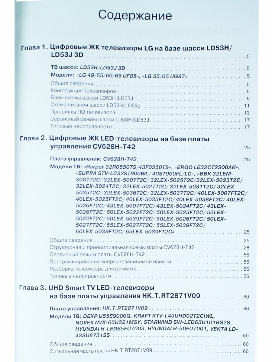 В очередной книге серии «Ремонт» описаны популярные модели современных «умных» (smart TV) жидкокристаллических телевизоров со светодиодной подсветкой, произведенных в 2015-2019 гг.