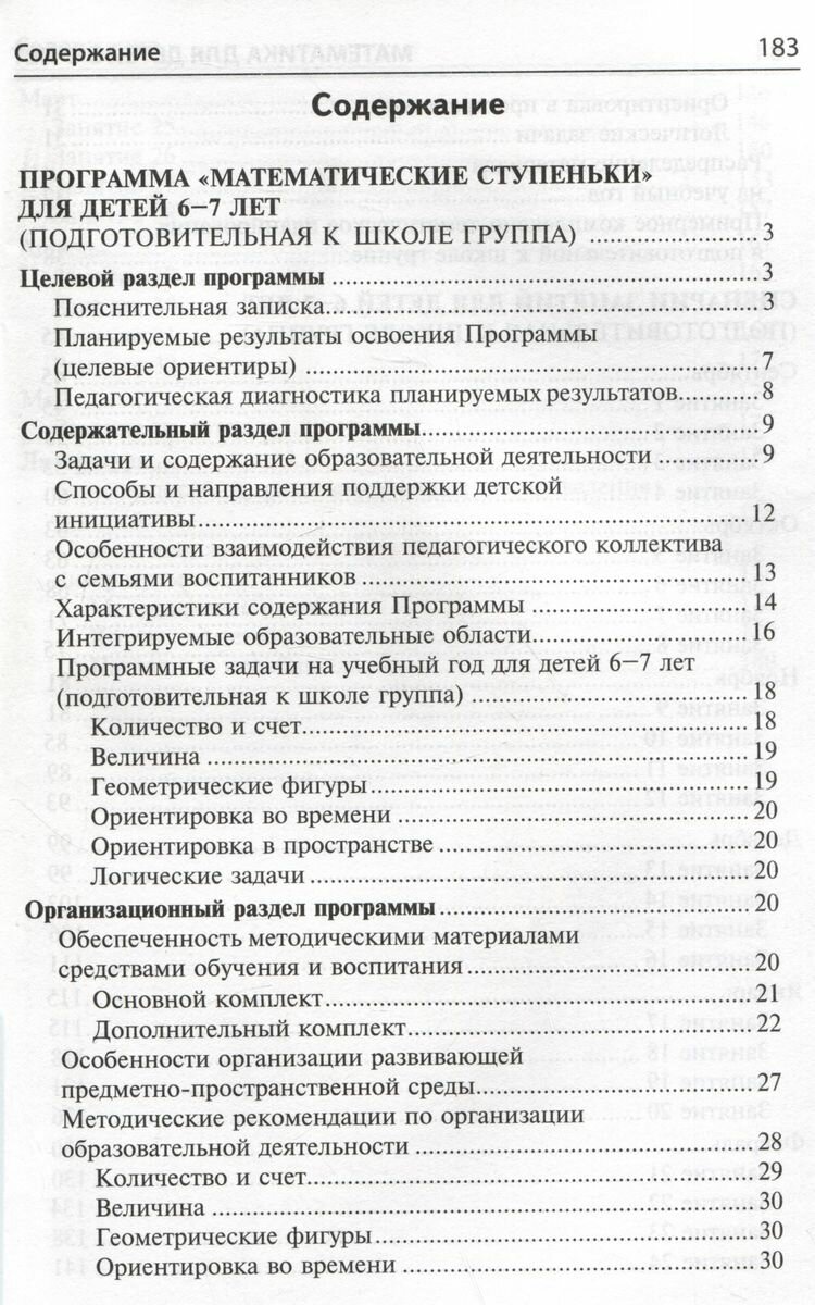 В организационно-методическое сопровождение программы «Математические ступеньки» для детей 6–7 лет входят: 1) данное методическое пособие, 2) рабочая тетрадь «Я считаю до двадцати», 3) демонстрационный материал, 4) книги дополнительного комплекта.