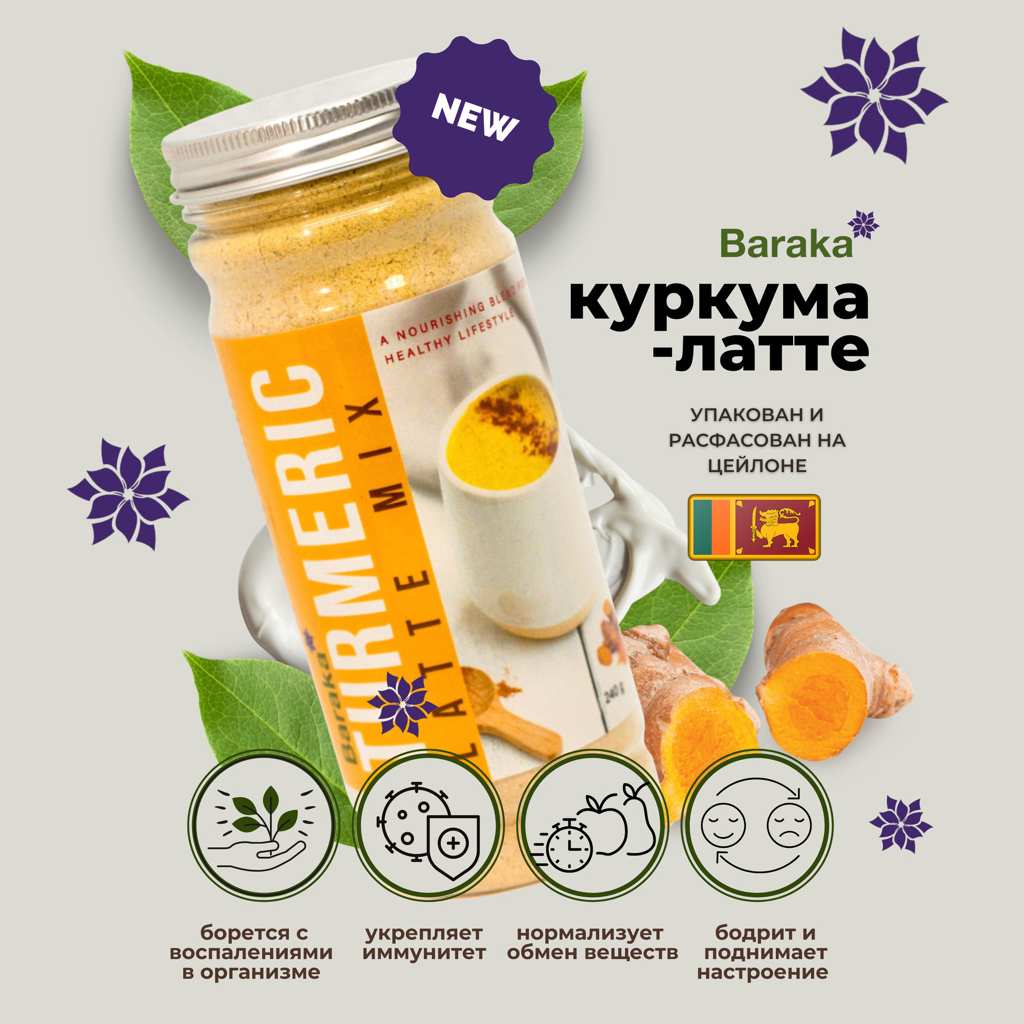 Куркума - Латте от Baraka - это 9 пряных специй ( куркума, черный тмин, имбирь, черный перец, корица цейлонская, гвоздика, лакрица, кардамон, мускатный орех) обогащенная сухим кокосовым молоком родом из Шри Ланки.Уникальность Куркумы - Латте от Baraka заключена в силе его состава!Мы создали идеальную версию классического аюрведического напитка, соединяющий в себе смесь специй (куркума, имбирь, черный перец, кардамон, корица), которые укрепляют общее состояние и здоровье и обогатили его ценными свойствами цейлонских специй черного тмина, гвоздика, лакрица и мускатный орех! Полезные свойства от применения:1. Антиоксидантное действие. Куркума - Латте действует как сильный антиоксидант: помогает замедлить окислительные процессы в организме, укрепить защиту от агрессивного воздействия окружающей среды, оказывает антивозрастное действие.2. Укрепляет иммунитет. Активное вещество куркумы — работает как противовоспалительное средство,а в сочетании с имбирем и черным тмином делает напиток куркума - латте мощной поддержкой для поддержания иммунитета.3. Борется с весом и холестерином. Благодаря своему составу снижает тягу к сладкому и жирному, предотвращает накопление жиров в организме и снижает уровень вредного холестерина.4. Является мощным природным антибиотиком, очищает кровь и улучшает ее циркуляцию, регулирует работу кишечника и нейтрализует действие свободных радикалов.5. Повышает настроение и уровень энергии. «Золотое молоко» так еще называют напиток Куркума-Латте, активизирует выработку эндорфинов, а это, в свою очередь, повышает стрессоустойчивость, настроение и уровень энергии.Интересный факт:Напиток Куркума-Латте 100% зеленый напиток, его могут употреблять и приверженцы вегетарианства, а также те, кто находится на безлактозной диете. Это возможно благодаря наличию в составе сухого кокосового молока высочайшего качества.Напиток Куркума-Латте упакован и расфасован на Цейлоне. Именно поэтому вы можете быть уверены в том, что в составе используются только специи высшего качества.