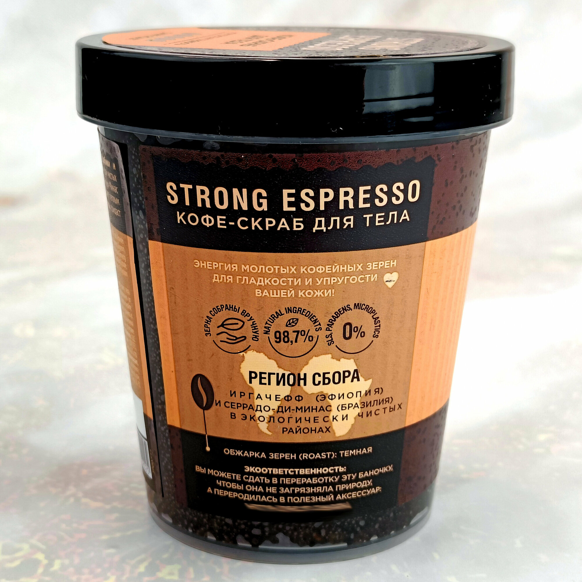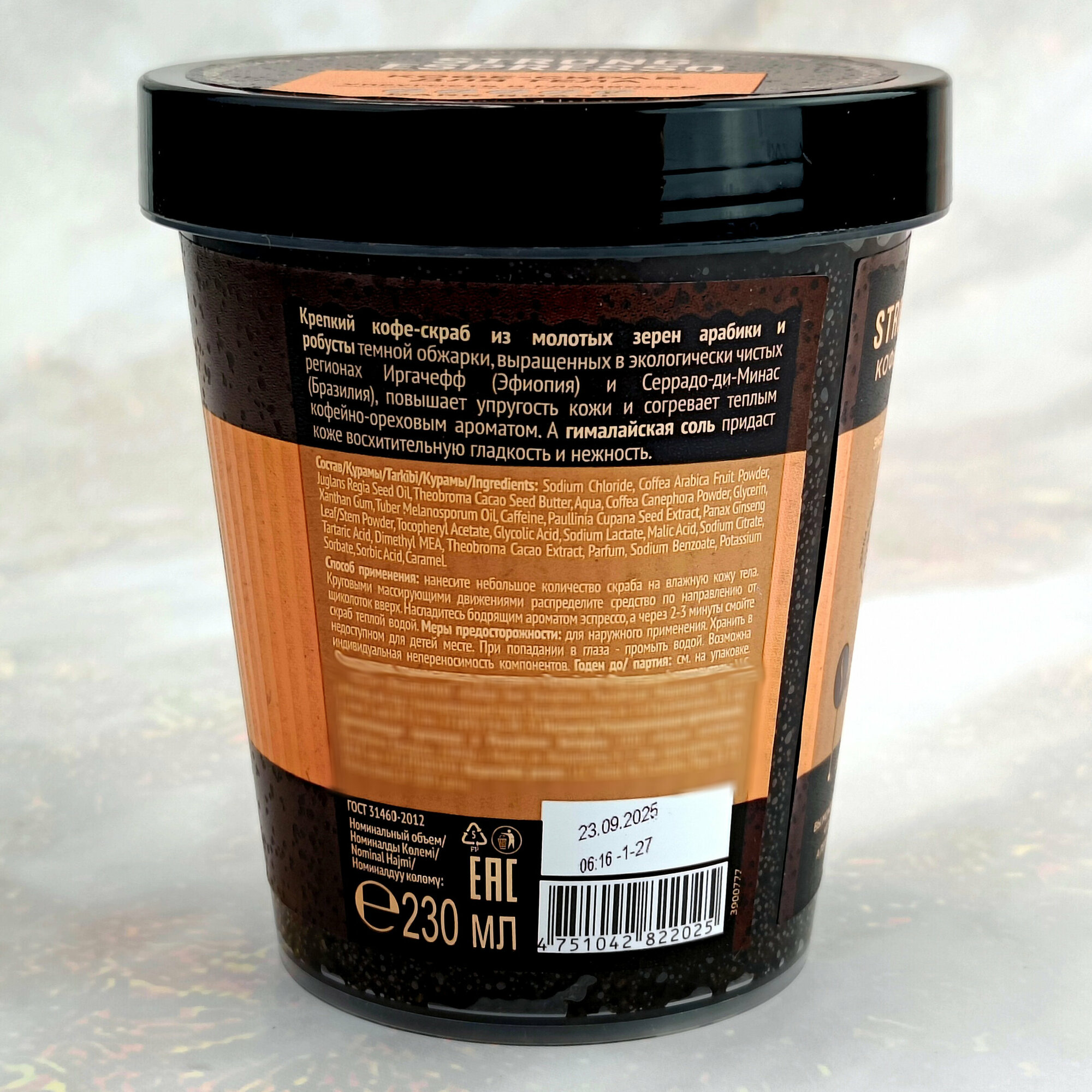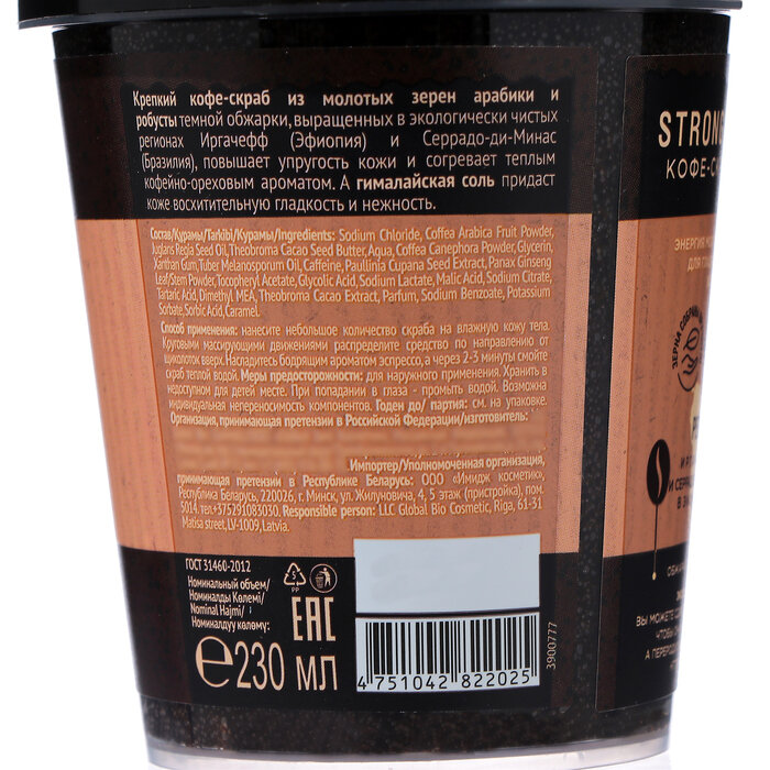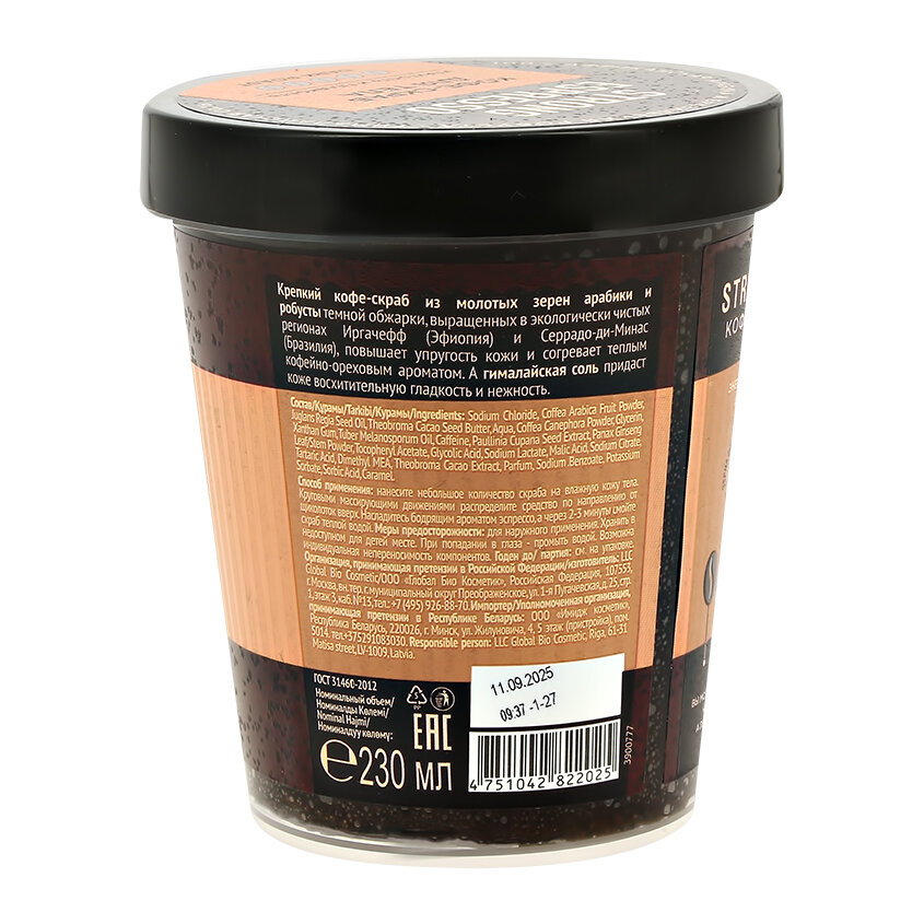 | Химический состав | Sodium Chloride, Coffea Arabica Fruit Powder, Juglans Regia Seed Oil, Theobroma Cacao Seed Butter, Aqua, Coffea Canephora Powder, Glycerin, Xanthan Gum, Tuber Melanosporum Oil, Caffeine, Paullinia Cupana Seed Extract, Panax Ginseng Leaf/Stem Powder, Tocopheryl Acetate, Glycolic Acid, Sodium Lactate, Malic Acid, Sodium Citrate, Tartaric Acid, Dimethyl MEA, Theobroma Cacao Extract, Parfum, Sodium Benzoate, Potassium Sorbate, Sorbic Acid, Caramel. |