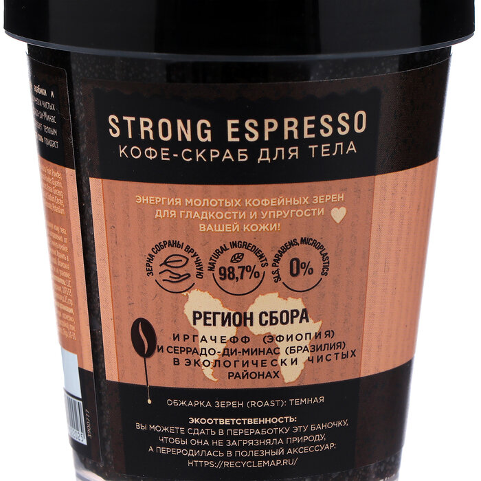 Крепкий кофе-скраб из молотых зерен арабики и робусты темной обжарки, выращенных в экологически чистых регионах Иргачефф (Эфиопия) и Серрадо-ди-Минас (Бразилия), повышает упругость кожи и согревает теплым кофейно-ореховым ароматом. А гималайская соль придаст коже восхитительную гладкость и нежность.
