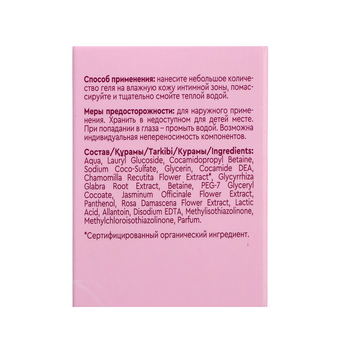 | Способ применения | Нанесите небольшое количество геля на влажную кожу интимной зоны, помассируйте и тщательно смойте теплой водой. |