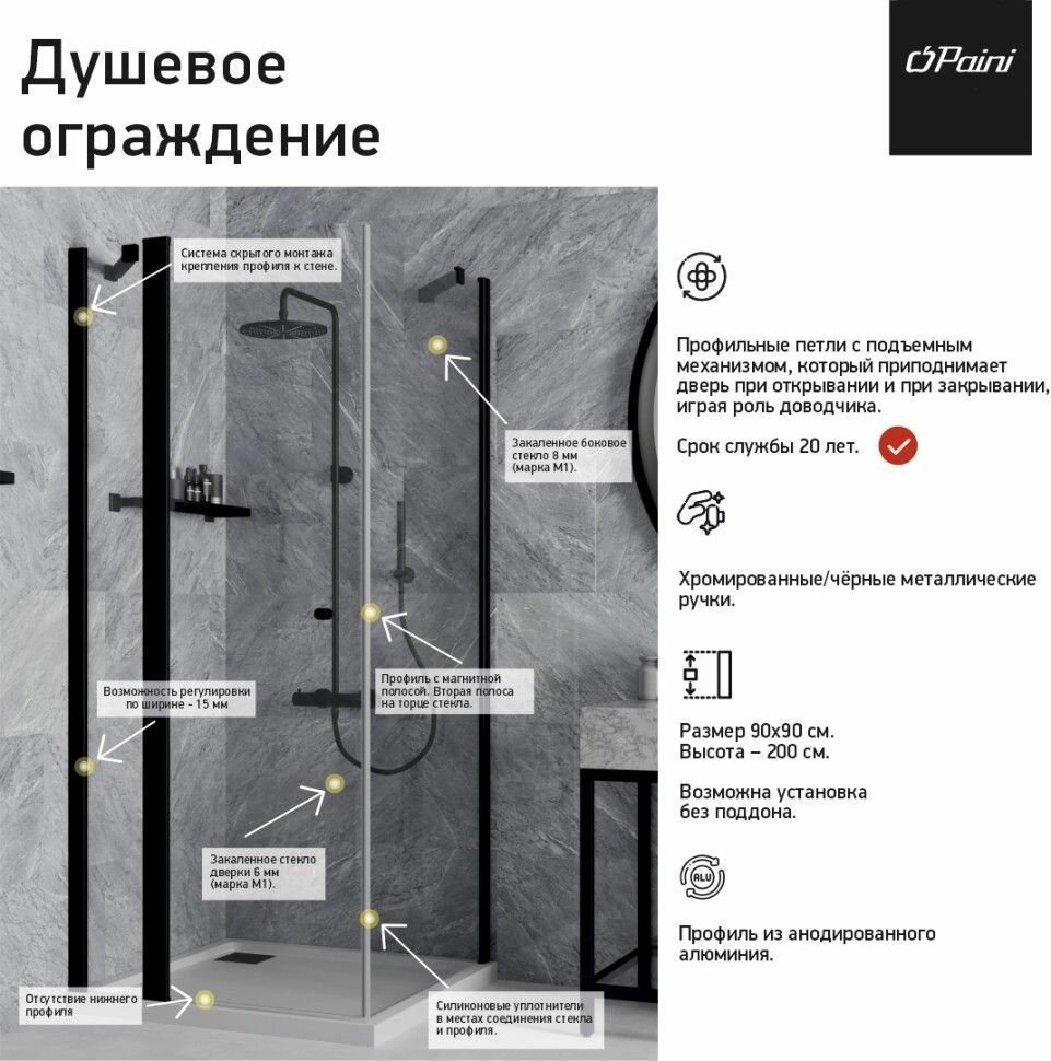 Фабрика премиум-класса Paini представляет удобное решение для дома. Душевое ограждение коллекции Cox позволяет отделить мокрую зону, разделив пространство. Профиль из анодированного алюминия с прочным покрытием черного цвета (YO) и закаленное стекло в сочетании с фурнитурой и комплектующими высшего класса обеспечивают безопасность, красоту конструкции и простоту в обращении. Надежность конструкции. Стекло марки М1 – безопасное, закаленное при температуре 700 градусов, не имеет искажений и прозрачное, а в случае повреждения не может нанести сильных увечий человеку. Профильные петли имеют подъемный механизм, который приподнимает дверь при открывании и при закрывании, играя роль доводчика. Долговечный профиль из анодированного алюминия легок в уходе и устойчив к механическим и химическим повреждениям. Легкая уборка. У изделий нет нижнего профиля, который чаще и больше требует внимания в процессе ухода за изделием. Закрытый тип верхнего профиля защищает от известковых отложений. Безбарьерная зона. Высота изделий 200 см. позволяет делать установку без поддона.
