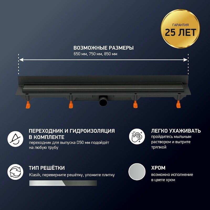 * Пристенный лоток, черный, без рамки Горизонтальный выпуск облегчает монтаж, трубы можно устанавливать по полу, что сэкономит бюджет, а пристенный монтаж бережет место в душевой. * Европейское качество Качество, подтвержденное гарантией производителя PAINI 25 лет. Срок службы не менее 30 лет. * Реальная экономия за счет уникальной конструкции Минимальная высота монтажа - 65 мм, не требует масштабной заливки пола и сложной установки. Ножки регулируются от 65 до 87 мм. * Высокая пропускная способность Пропускная способность от 30 до 37 л/мин в лотках "паини" не позволит воде задерживаться в душевой. * Надежная защита от неприятных запахов Комбинированный затвор (сухой + гидрозатвор) не пропускает запахи в помещение, надежно защищая вас от неприятных сюрпризов. Такая конструкция сифона в душевом лотке считается самой универсальной и надежной защитой от запахов и бактерий. Сифоны такой конструкции отличает двухуровневая защита: водяная пробка не пропускает запахи при постоянной эксплуатации, а воздушная поплавковая система является дополнительной преградой, при пересыхании водяной пробки. * Разнообразие размеров Размерный ряд лотков: 650, 750, 850 мм. * Покрытие, устойчивое к повреждениям Корпус моделей в цвете черный (YO) защищен финишным цветным покрытием в технике порошковой окраски с использованием эпоксидных смол для большей устойчивости к повреждениям. Комплектация Переходник для выпуска D50 мм позволяет не задумываться о монтаже - подойдет на любую трубу. Гидроизоляционная лента в комплекте. Технические характеристики Назначение лоток Ширина изделия 650 мм Тип затвора сифона комбинированный Пропускная способность, л/мин 30-38 Диаметр слива 40 мм Направление выпуска в канализацию горизонтальный Монтаж пристенный Материал решетки нержавеющая сталь Общая высота монтажа 65 - 87 мм Предельно допустимая нагрузка 300 кг Материал желоба пластик Вес 2.1 кг Длина упаковки 975 мм Высота упаковки 100 мм Ширина упаковки 140 мм Под плитку да Узор решётки klasik Страна производитель Чехия Гарантия 25 лет Цвет изделия черный матовый