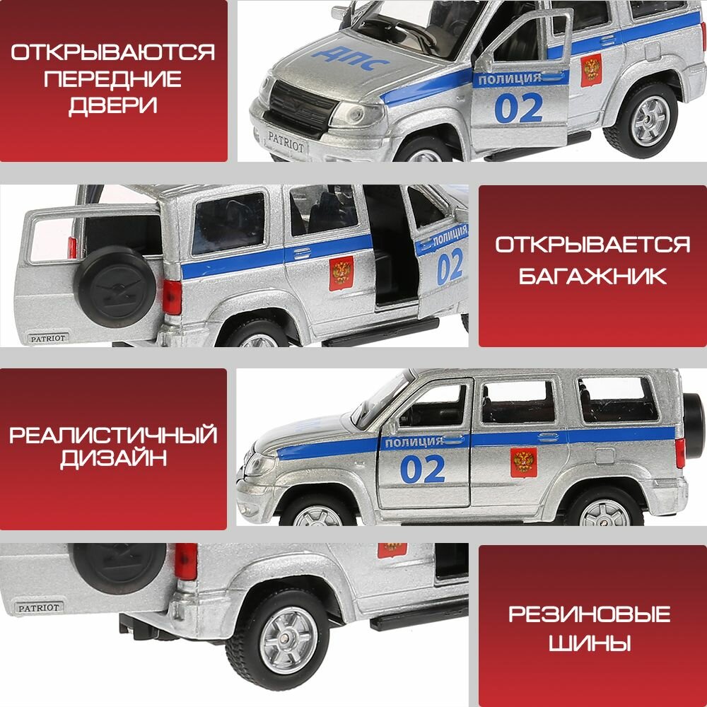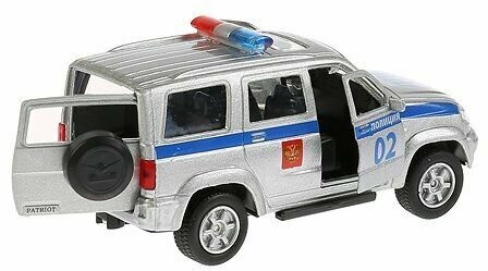 Ваш малыш будет рад пополнить свой домашний автопарк металлической машиной УАЗ Patriot полиция. Этот автомобиль точная копия оригинала! У него открываются двери и багажник, есть проблесковые маячки и полицейская символика. А используя инерционный механизм ваш ребёнок может устраивать настоящие гонки! С такими машинками знакомиться с марками автомобилей и спецтехникой, развивать мелкую моторику рук и фантазировать одно удовольствие.