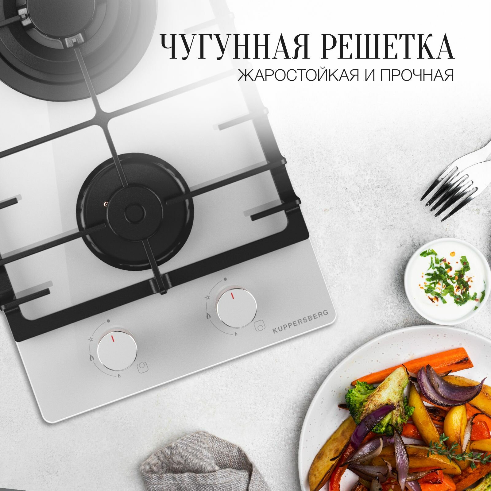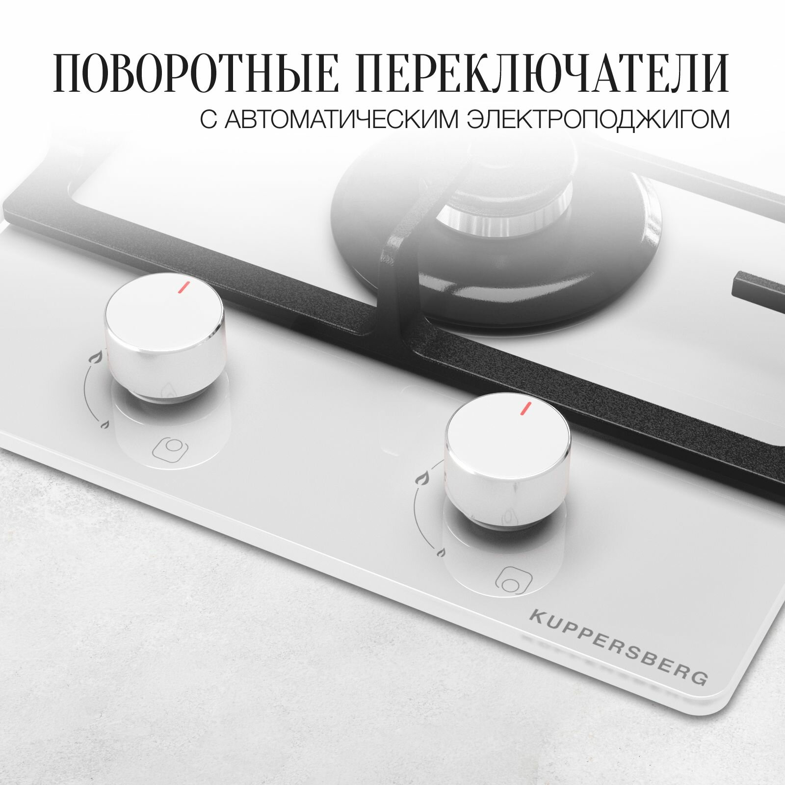 Встраиваемая независимая газовая панель Kuppersberg размером 320х520 мм устанавливается в нишу 490х290 мм, которая сделана в столешнице толщиной от 30 мм. Варочная панель весом 7,9 кг выполнена из жаростойкого закаленного стекла цвета «античный белый». Используемый материал легко очищается и долго сохраняет изначальные внешние характеристики. Чугунная решетка не деформируется со временем. Устройство подсоединяется к сети за счет кабеля. Защита от случайного запуска и газ-контроль конфорок обеспечивают безопасную эксплуатацию. Прибор укомплектован жиклером и штуцером для подключения баллона. Одна двухконтурная Wok и одна стандартная зоны нагрева мощностью 2,5 и 1 кВт отличаются функцией реподжига. Механические регуляторы для настройки интенсивности пламени расположены спереди.