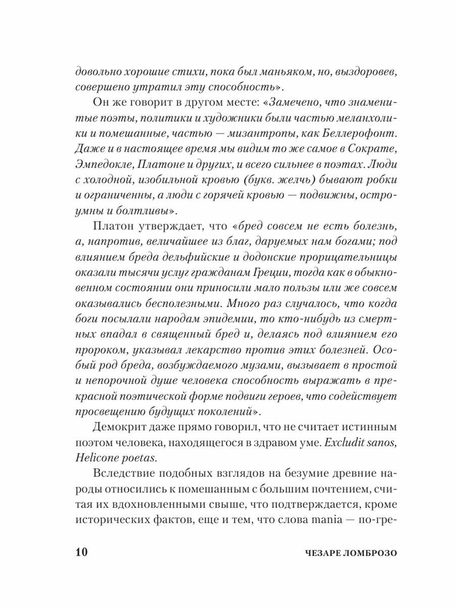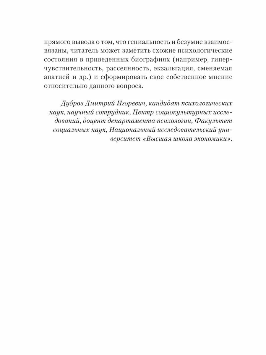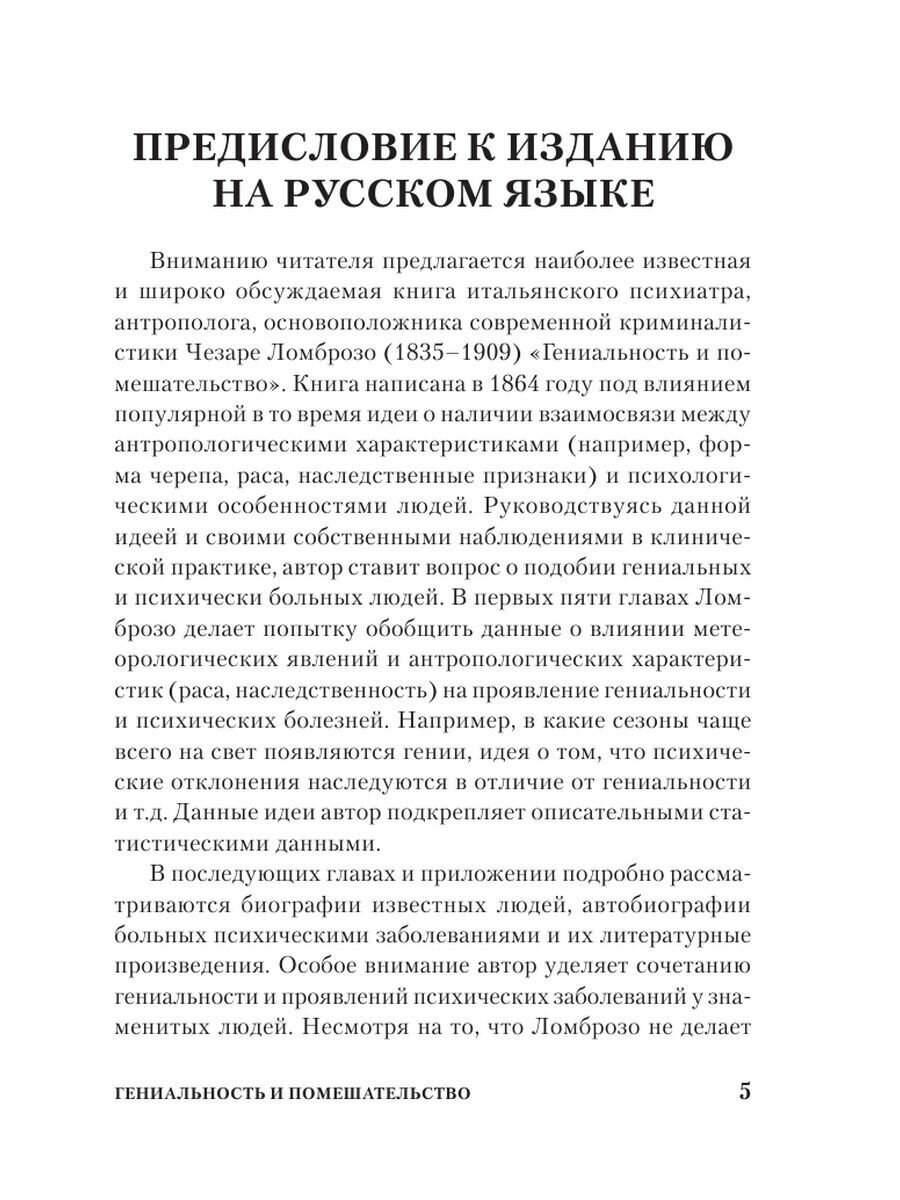 Чезаре Ломброзо (1835–1909) – профессор юридической психиатрии и криминальной антропологии. В своем труде автор рассматривает сходство гениальных людей с сумасшедшими с разных точек зрения: с физиологической, психической и даже погодных условий. На примере величайших ученых, писателей и художников автор рассматривает характерные признаки гениальности и сумасшествия.