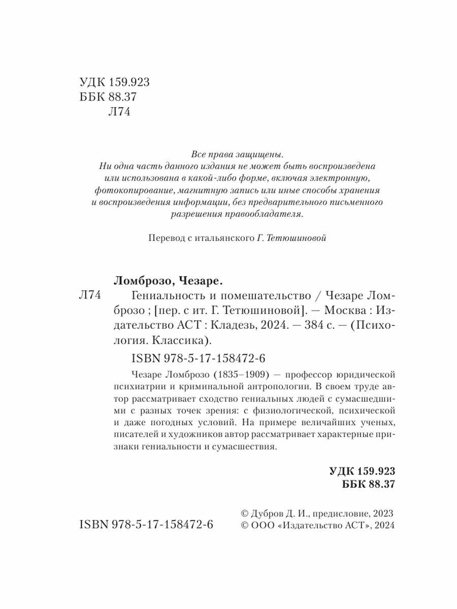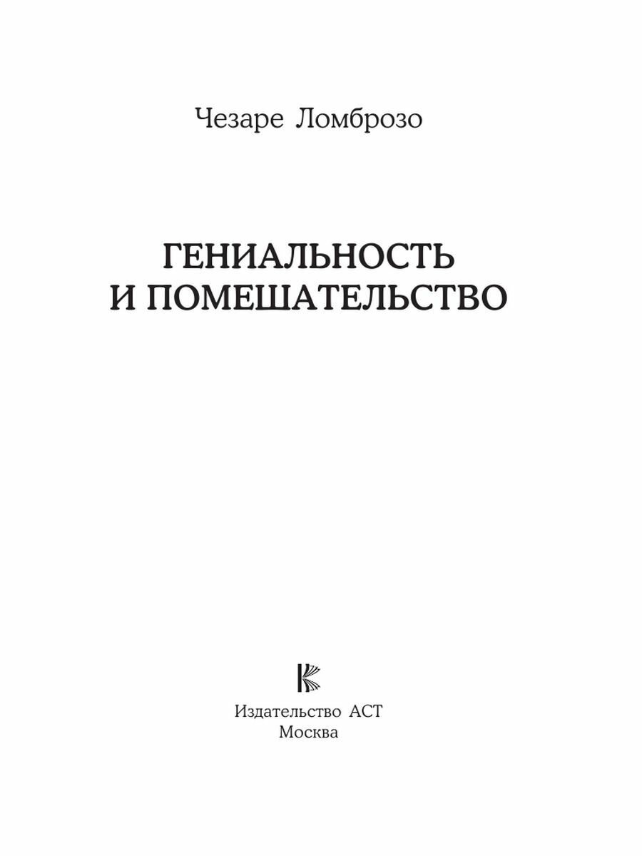 Гениальность и помешательство (Чезаре Ломброзо); АСТ, Кладезь, 2023