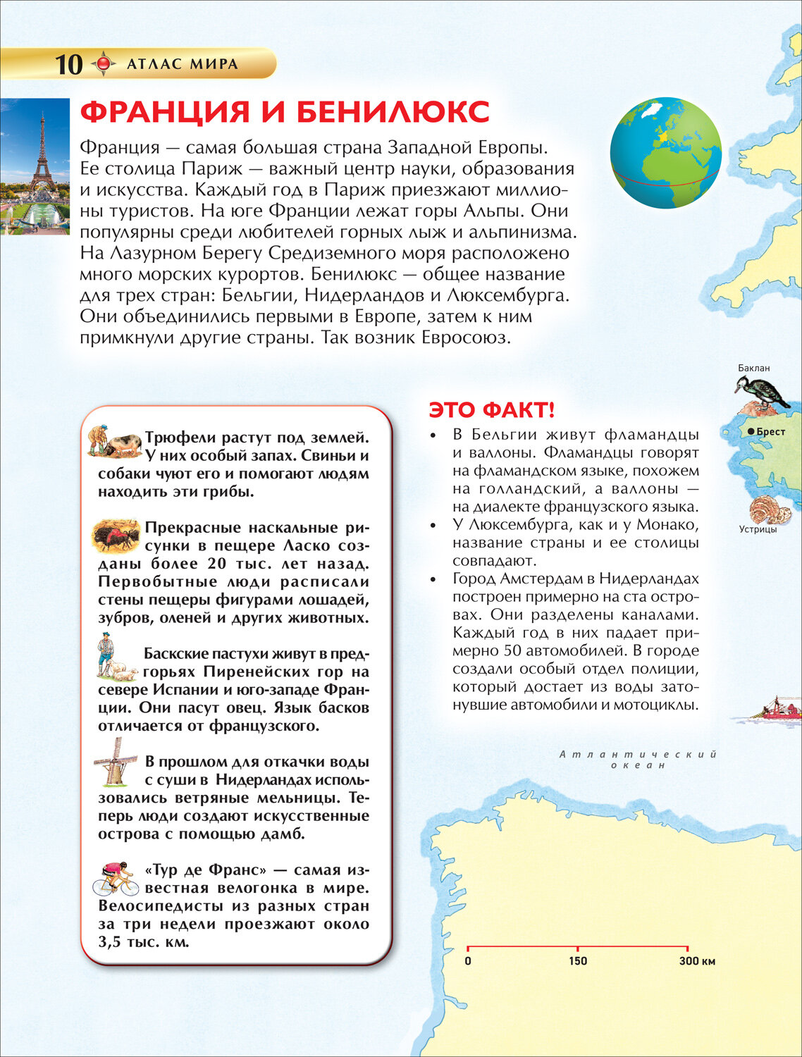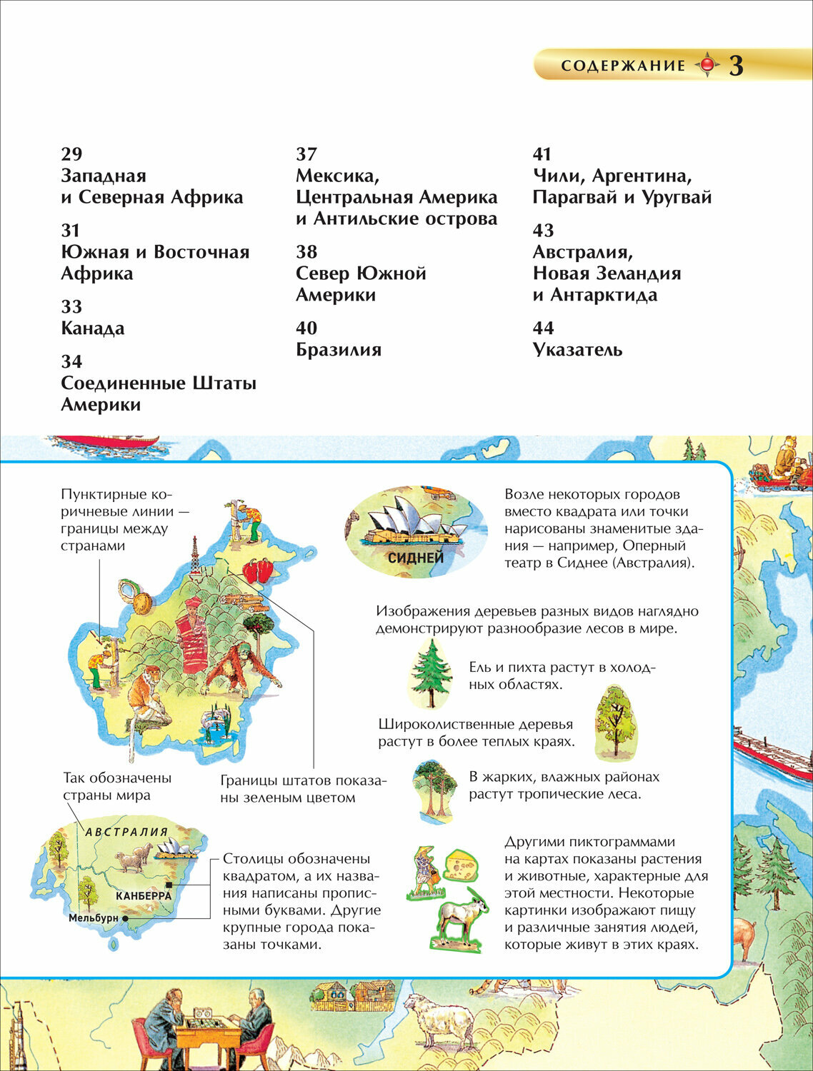 Этот географический атлас — кладезь информации для школьников! Благодаря продуманной системе пиктограмм ученики быстро и без утомительных повторений выучат особенности рельефа, климатические зоны и залежи полезных ископаемых различных стран; запомнят флору и фауну разных уголков Земли; узнают о традиционных профессиях и областях экономики тех или иных государств; познакомятся с природными чудесами света, национальными достопримечательностями и памятниками архитектуры. Рубрика «Это факт!» добавит любопытные и полезные сведения о странах мира в копилку знаний школьника, а подробный указатель поможет ему быстро найти нужный географический объек