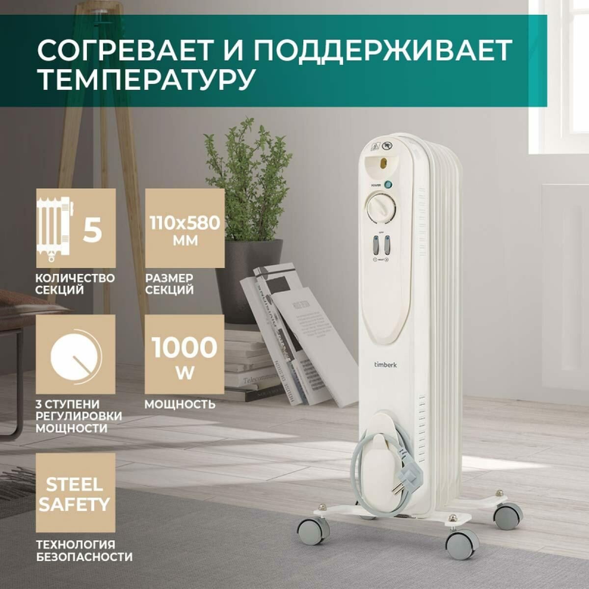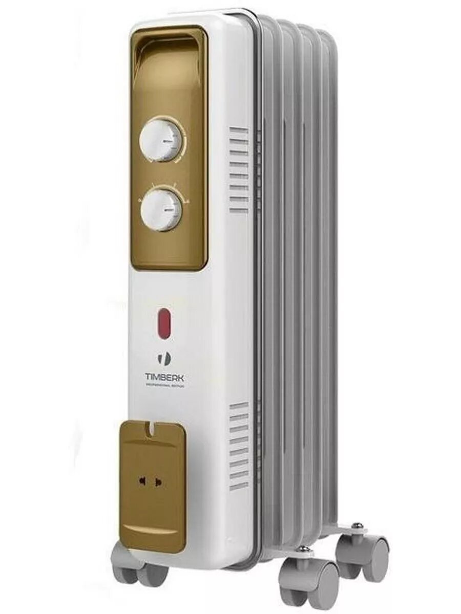 Масляный радиатор компании Timberk является эргономичным и эффективным решением для обогрева помещений. Обогреватели данного типа безопасны в эксплуатации и подходят для пользования в детской комнате. Представленная модель произведена с 5 обогревательными секциями, ширина которых составляет 110 мм, что обеспечивает меньшее потребление электроэнергии. Номинальная мощность устройства составляет 1000 Вт, что подходит для обогрева площади 13-15 м2.