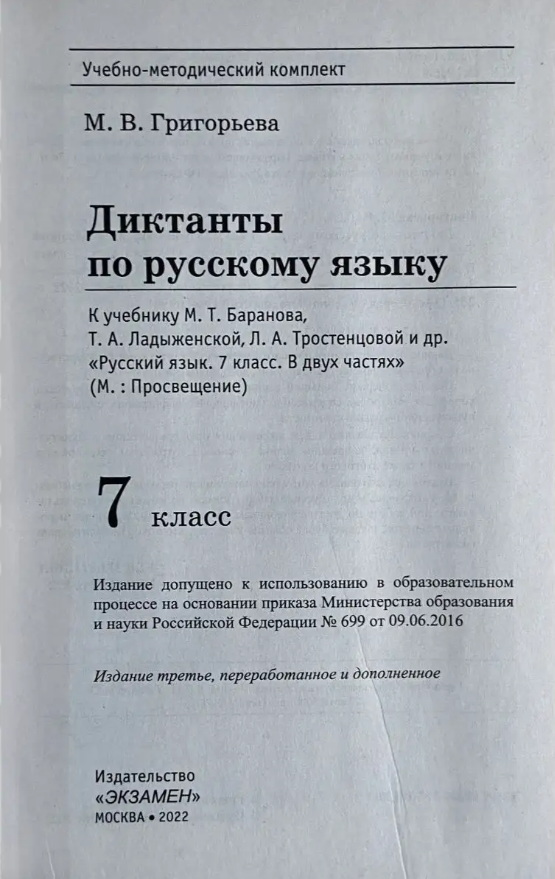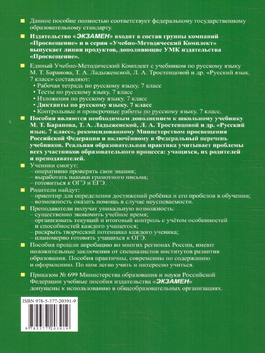 Русский язык. 7 класс. Диктанты. К учебнику М. Т. Баранова (Григорьева Марина Викторовна,Григорьева Мария Викторовна); Экзамен Издательство, 2024