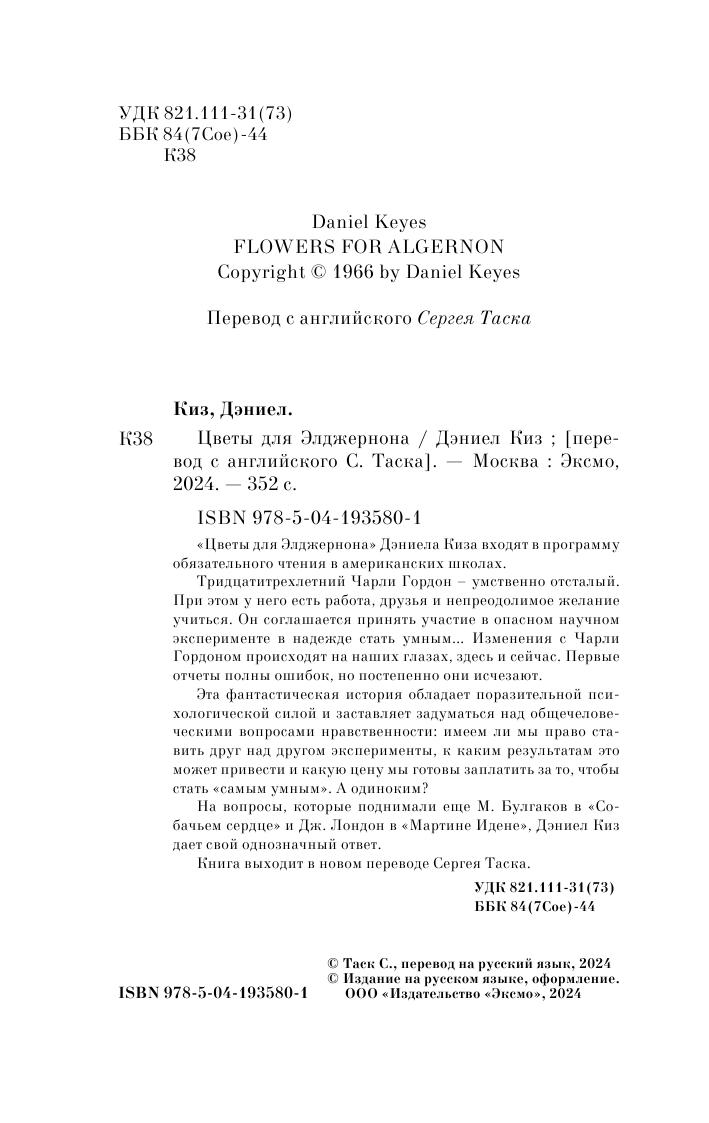 Книга: Цветы для Элджернона (Дэниел Киз); Эксмо, Редакция 1, 2025