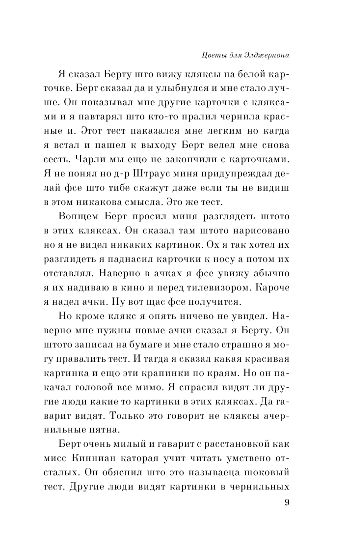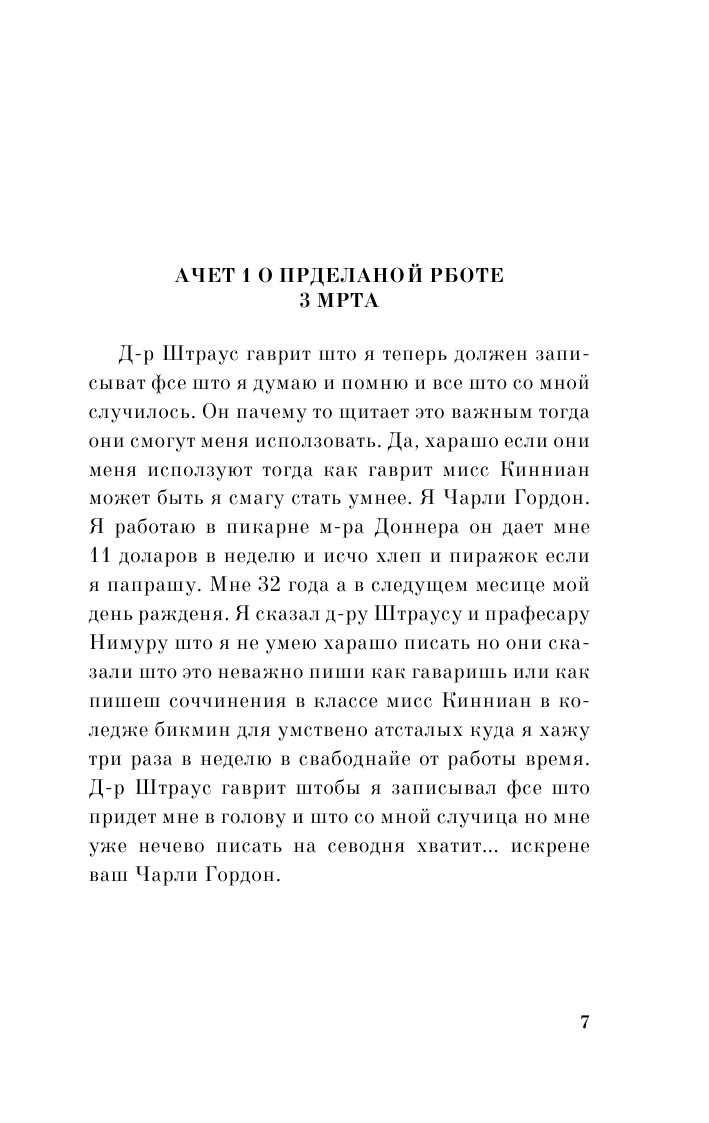 Изменения с Чарли Гордоном происходят на наших глазах, здесь и сейчас. Первые отчеты полны ошибок, а потом они исчезают, и изложение мыслей становится безупречным. А в итоге — все просто. Гении и идиоты — две стороны одной медали. У них разные IQ, отличаются условия жизни, но они похожи в одном — часто и те, и другие бесконечно одиноки. А цена за мечту — стать умным — становится слишком высокой.