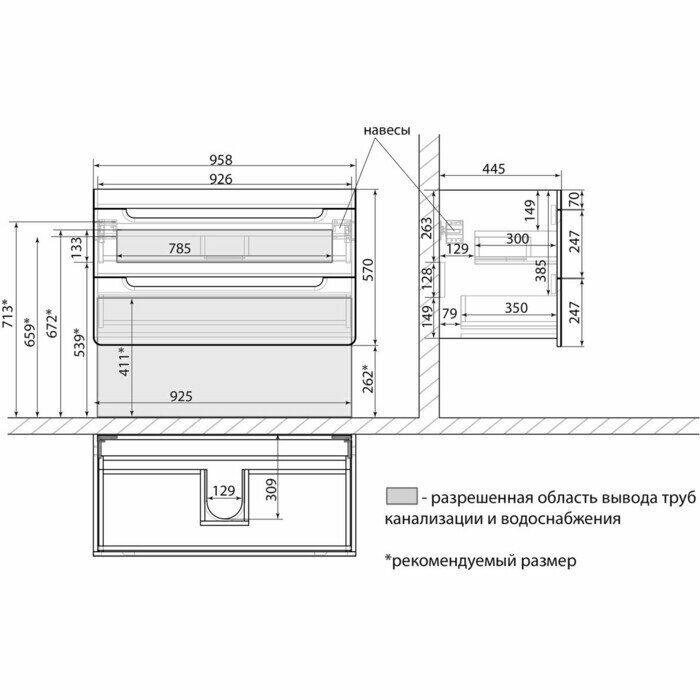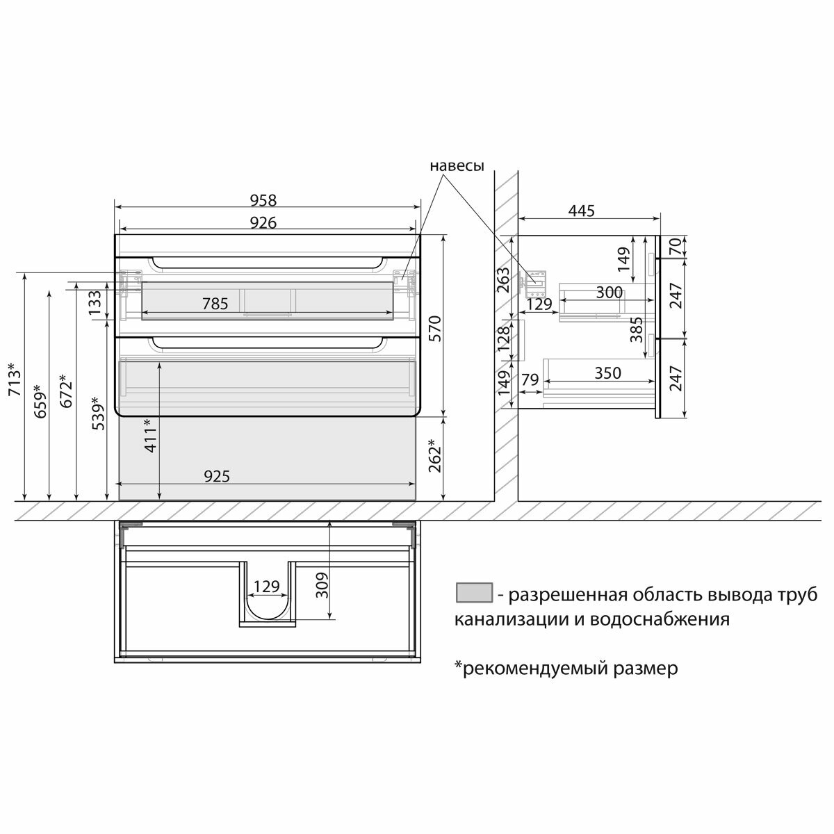 - Габариты корпуса тумбы (ШхВхГ): 958х540х445 мм.