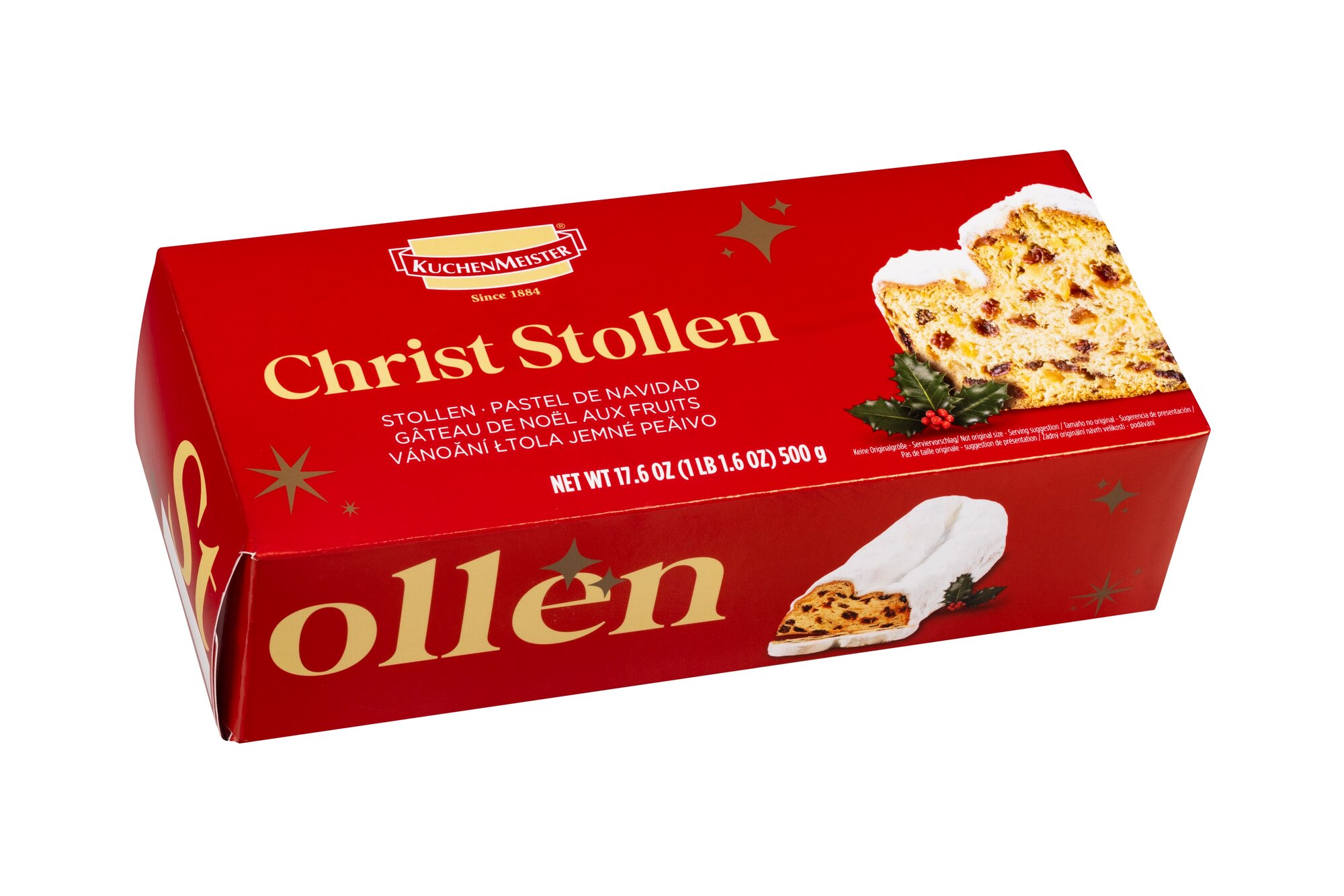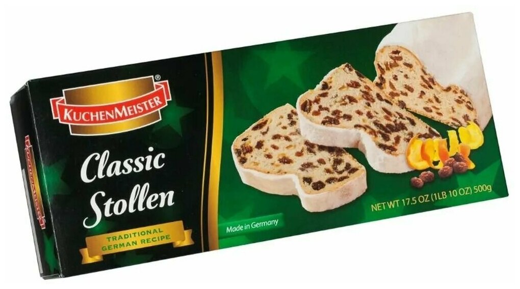 Попробуйте рождественский штоллен KuchenMeister - традиционный кекс с ароматной начинкой из изюма и цукатов из цитрусовых. Он обладает нежным сладким вкусом и приятной плотной текстурой благодаря выдержанному тесту, а аромат рождественского сезона передают особые специи. Сверху кекс обильно посыпан нежной и воздушной сахарной пудрой.