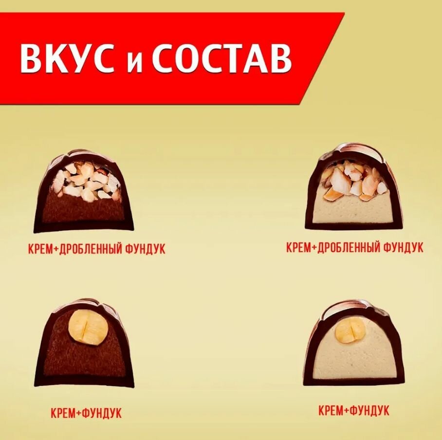 | Состав | шоколад для формования, сахарная пудра, жир кондитерский, молоко сухое, ядро ореха фундука жареное, ядро ореха фундука жареное дробленое, ядро ореха фундука жареное тертое, какао-порошок, эмульгатор (лецитин), ароматизатор “лесной орех ” |