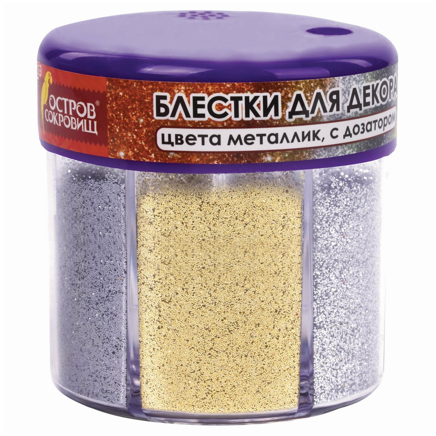 Блестки для декорирования ОСТРОВ СОКРОВИЩ используются для декорирования различных поделок и аппликаций, в украшении предметов интерьера, изготовлении поздравительных открыток и других изделий в различных техниках рукоделия. Мелкие россыпные блестки подходят для любых декоративных работ и творчества, создают замечательный сияющий эффект. Мелкий глиттер можно добавлять на клеевую основу, украшать рисунки, открытки, поделки. Блестки подходят для любых поверхностей и всех типов красок и лаков. В наборе 6 цветов металлик по 10 грамм каждого цвета. Удобный диспенсер, сделанный по принципу солонки, позволят использовать только выбранный цвет, не задействовав при этом другие. Компактная упаковка 6,5х6х6 см позволяет хранить все цвета в одном месте.Сделайте Ваши поделки ярче вместе с блестками ОСТРОВ СОКРОВИЩ!