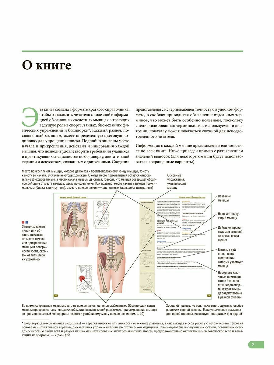 Формат справочника предоставляет читателю возможность определять расположение конкретных мышц и идентифицировать их. Особое внимание уделяется мышцам, несущим основную нагрузку и потому подверженным травмам при выполнении разных бытовых задач и во время занятий спортом.