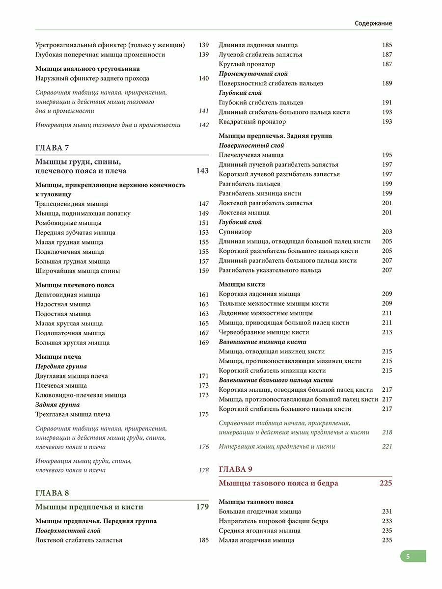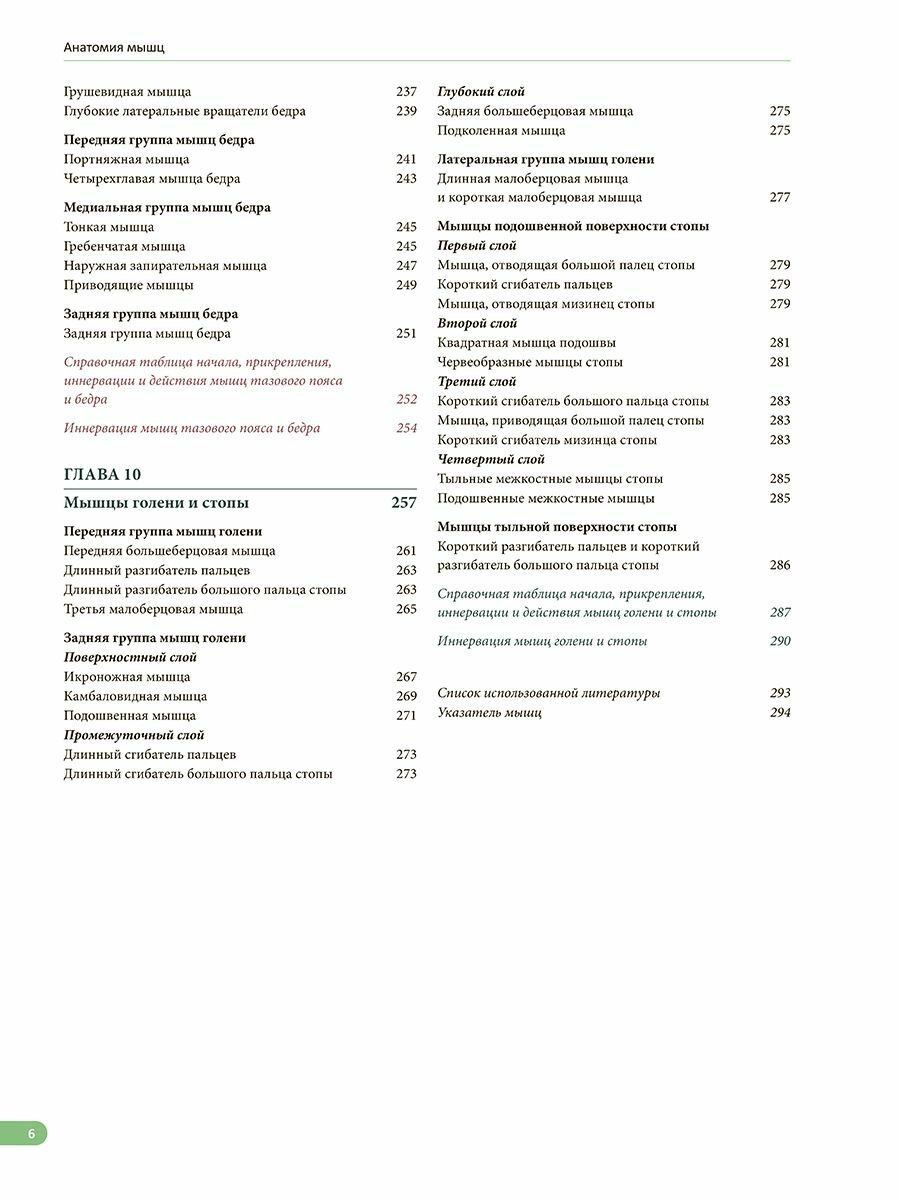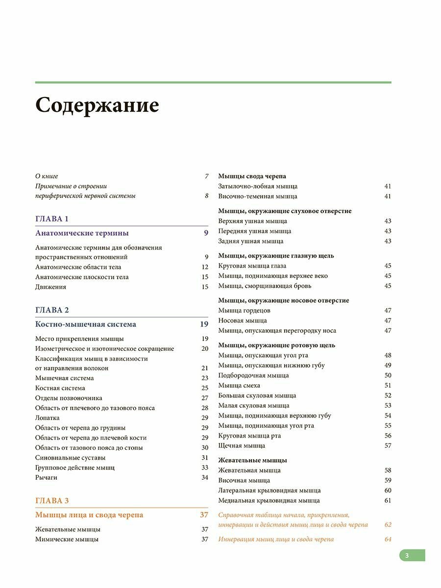 Каждая глава, посвященная той или иной части тела, включает общий обзор соответствующей мускулатуры, рассматривает строение костной системы, мышечные слои в поперечном разрезе и точки прикрепления мышц, а также приводит краткую справочную таблицу и перечень основных нервных путей. Глава о мышцах тазового дна представляет особый интерес для тех, кто практикует йогу и пилатес.