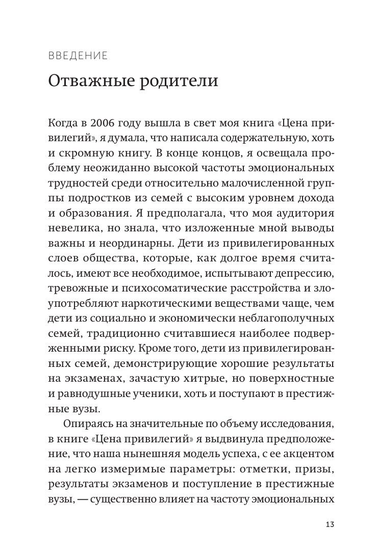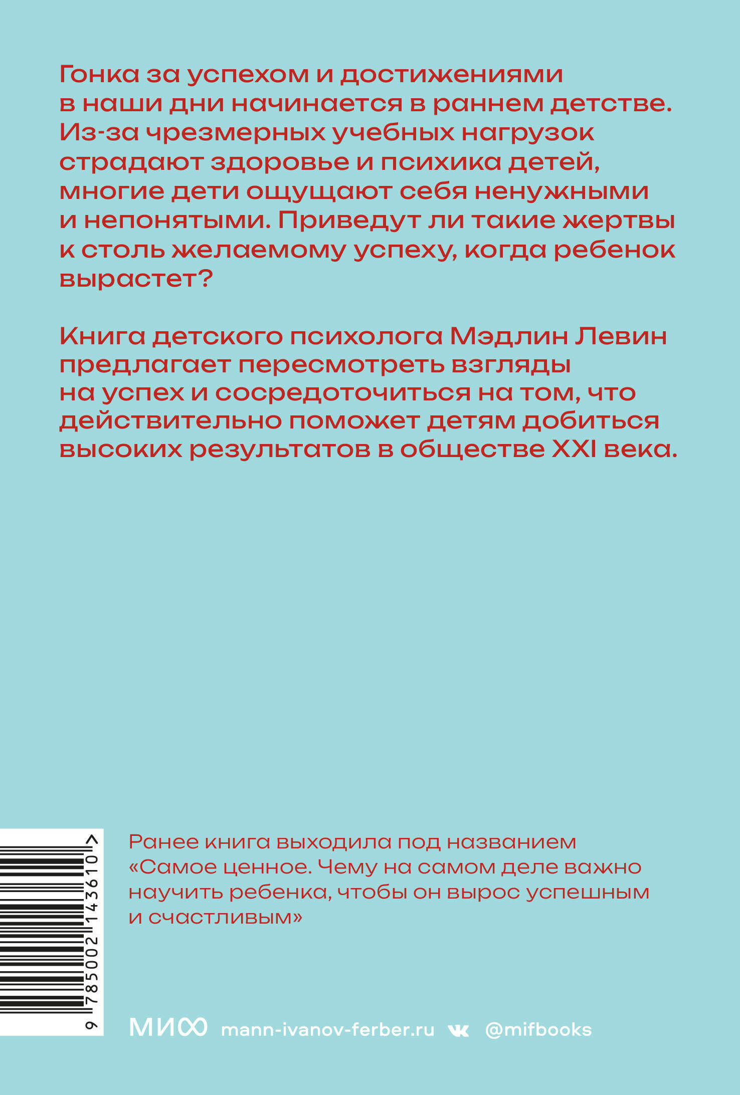 Мэдлин Левин, практикующий психолог с 40-летним опытом, пересматривает существующие взгляды на успех. Она предлагает сосредоточиться на качествах, которые значат больше, чем оценки и поступление в вуз, и помогут ребенку вырасти по-настоящему счастливым человеком. Ранее книга выходила под названием "Самое ценное". Гонка за успехом и достижениями в наши дни начинается в глубоком детстве. Из-за чрезмерных нагрузок страдает здоровье и психика детей, многие ощущают себя ненужными и непонятыми. Приведут ли такие жертвы к столь желаемому успеху, когда ребенок вырастет? Детский психолог Мэдлин Левин убедительно доказывает, что нет. В обществе XXI века человек станет успешным, если научится сотрудничать, задавать хорошие вопросы и противостоять трудностям. Развитие эмпатии, самоконтроля, правильного самовосприятия и еще целого ряда важных качеств поможет многого добиться в различных сферах жизни. Автор предлагает развивать у детей семь главных навыков преодоления трудностей, которые станут надежной опорой в жизни. Кроме того, родителям предстоит разобраться с собственными ценностями и сделать их частью воспитания, ведь именно родительский пример является лучшим методом воздействия на детей. Для кого эта книга Для каждого родителя, у которого есть дети от 5 до 18 лет. От автора Чрезмерное внимание к тем параметрам, которыми определяют успех сегодня: высоким отметкам, призам и приему на конкурсной основе в детские сады, школы и колледжи, — неполное его определение, часто вводящее в заблуждение. Это создает ложное предположение, что высокие достижения в учебе в раннем возрасте — предвестник успешности во многих сферах, включая межличностные отношения и самовосприятие. Иногда это так; но часто — иначе. Было бы неплохо начать думать об успехе не с точки зрения сегодняшнего дня, следующего семестра или учебного года, но с точки зрения того, какими мы надеемся видеть наших детей через десять или двадцать лет, когда они покинут дом и уйдут в самостоятельную жизнь. Да, чтобы воспитывать детей с учетом такой долгосрочной перспективы, требуются мужество и воображение. Но это также самый эффективный способ обеспечить им полноценную, значимую жизнь. Мы должны сместить акцент с гиперопеки, одержимости узким пониманием успеха и нездорового ожидания, что они придадут статус и смысл нашей собственной жизни, и вернуться к основам воспитания, чтобы дети росли здоровыми личностями, оставаясь собой.