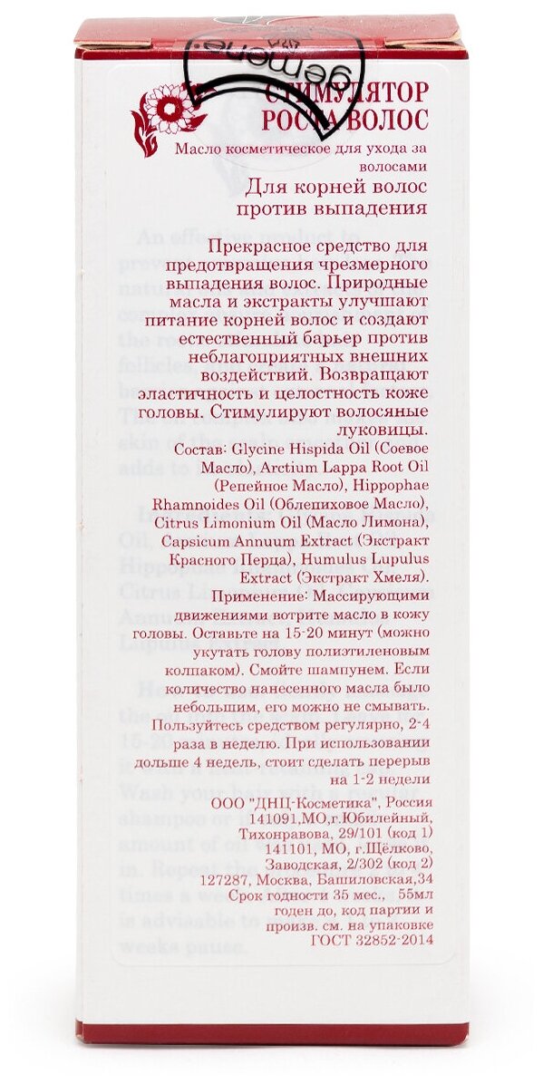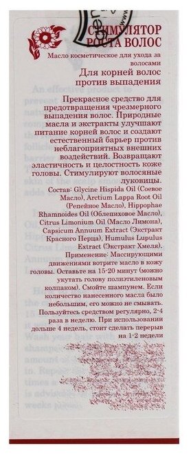 | Состав | репейное масло; соевое масло; экстракт красного перца; масло лимона; экстракт хмеля; масло облепиховое |