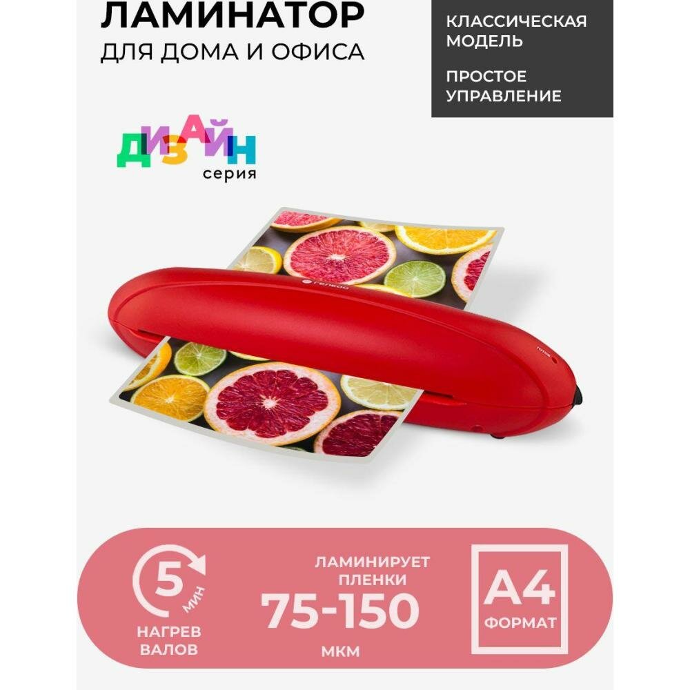Пакетный компактный 2-х валовый ламинатор ГЕЛЕОС ЛМА4-Р для ламинирования документов формата А4 и меньше. Эта яркая, дизайнерская, веселая модель ламинатора разместится в любом уголке помещения и создаст свое настроение в интерьере. Замечательно подойдет для детских учреждений, таких как детский сад и школа, в комнате у ребенка. В офисе яркий цвет ламинатора не даст заскучать. Форма ламинатора обтекаемая, без углов.Заламинирует необходимый материал со скоростью 250 мм/мин. Фиксированная температура горячего ламинирования позволяет использовать пленки плотностью от 75 до 150 мкм. Чем больше мкм в пленке, тем жестче будет готовый материал. Очень простое и удобное управление. Рабочая панель на русском языке. Световая индикация вовремя предупредит о готовности валов к работе. Всего 3-4 минуты нагрева и можно ламинировать. Максимальная толщина ламинирования документов 0,6 мм.Что можно заламинировать? Все, что толщиной до 0,6 мм (учитывая пленку) и находится на бумаге. Ламинирование детских рисунков - поможет защитить их на долгие годы и сделает краски еще более насыщенными. Ламинирование учебных пособий, карточек со словами, памяток, презентаций – очень актуально для занятий с маленькими детьми и не переживать, что карточки порвутся или испортятся. Идеальное решение для воспитателей и учителей. Ламинирование фотографий – защитит их от выгорания, влаги. Вы сможете оформить свой фотоальбом. А бывают ситуации, в которых фотографии, информационные листы, объявления, вывески, меню ресторанов и кафе, указатели используются на улице, и в таких случаях ламинирование приходится как нельзя кстати. Ламинирование грамот, сертификатов, дипломов - заламинированные дипломы, грамоты и сертификаты можно развесить на самом видном месте — пусть памятки о ваших достижениях всегда радуют глаз, воспламеняют гордость и вдохновляют на новые победы! Ламинирование рецептов – вы любите готовить и используете уникальные семейные рецепты, которые передаются из поколения в поколение? Просто заламинируйте рецепт — и вам не придется волноваться, о том, как бы не испачкать его случайно и не пролить на него жидкость.