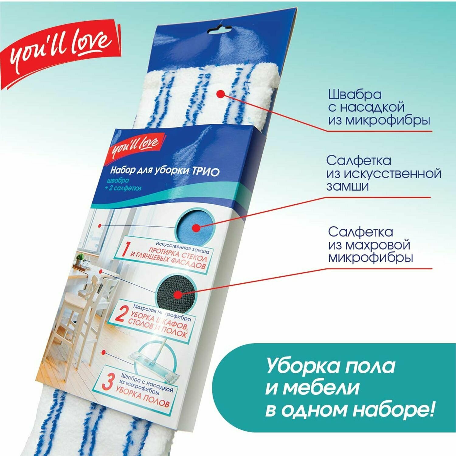 Набор для уборки You'll love Трио швабра с насадкой 2 салфетки