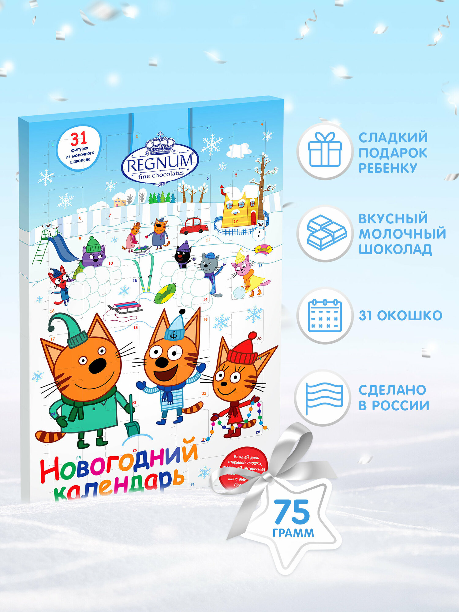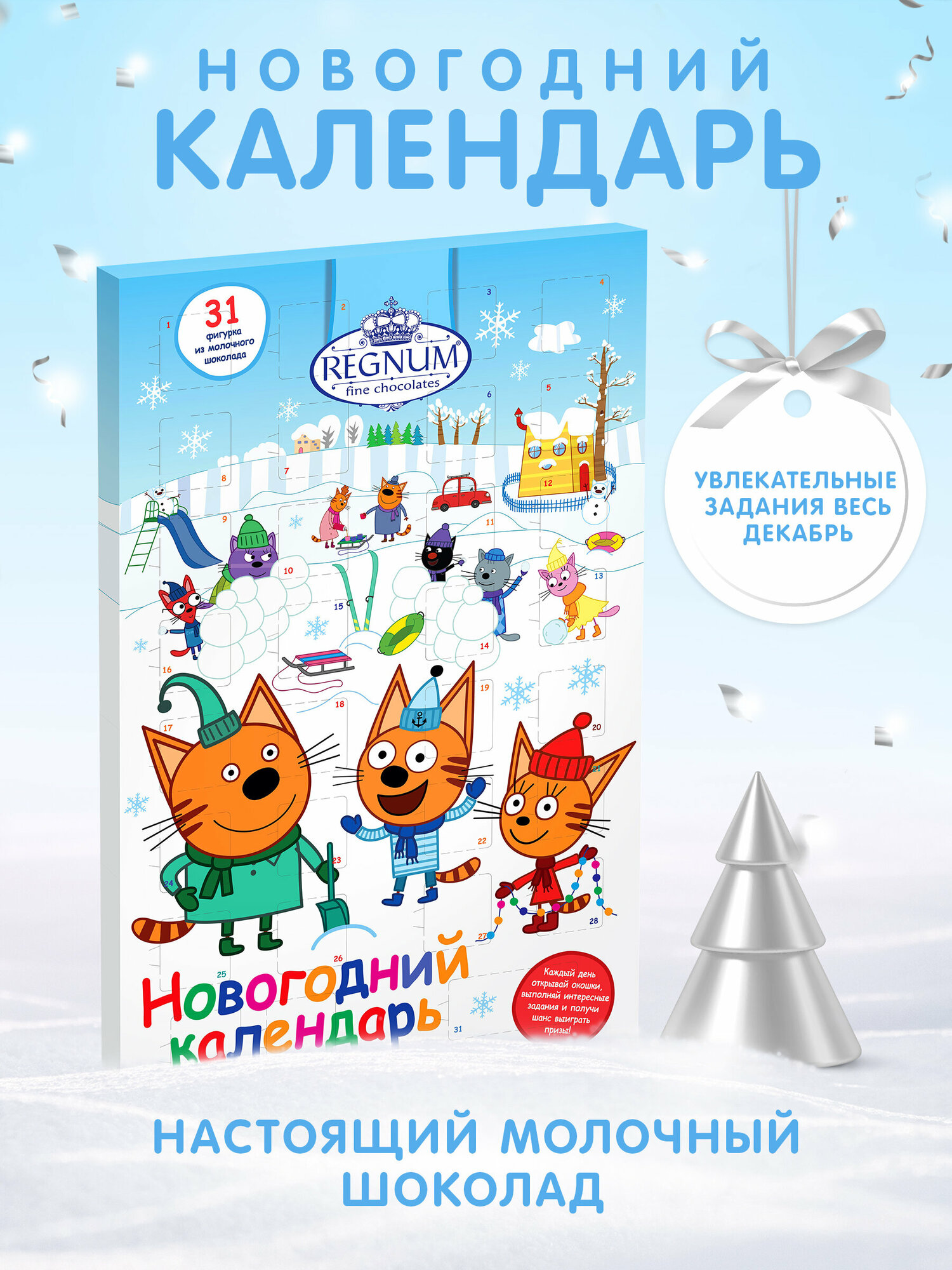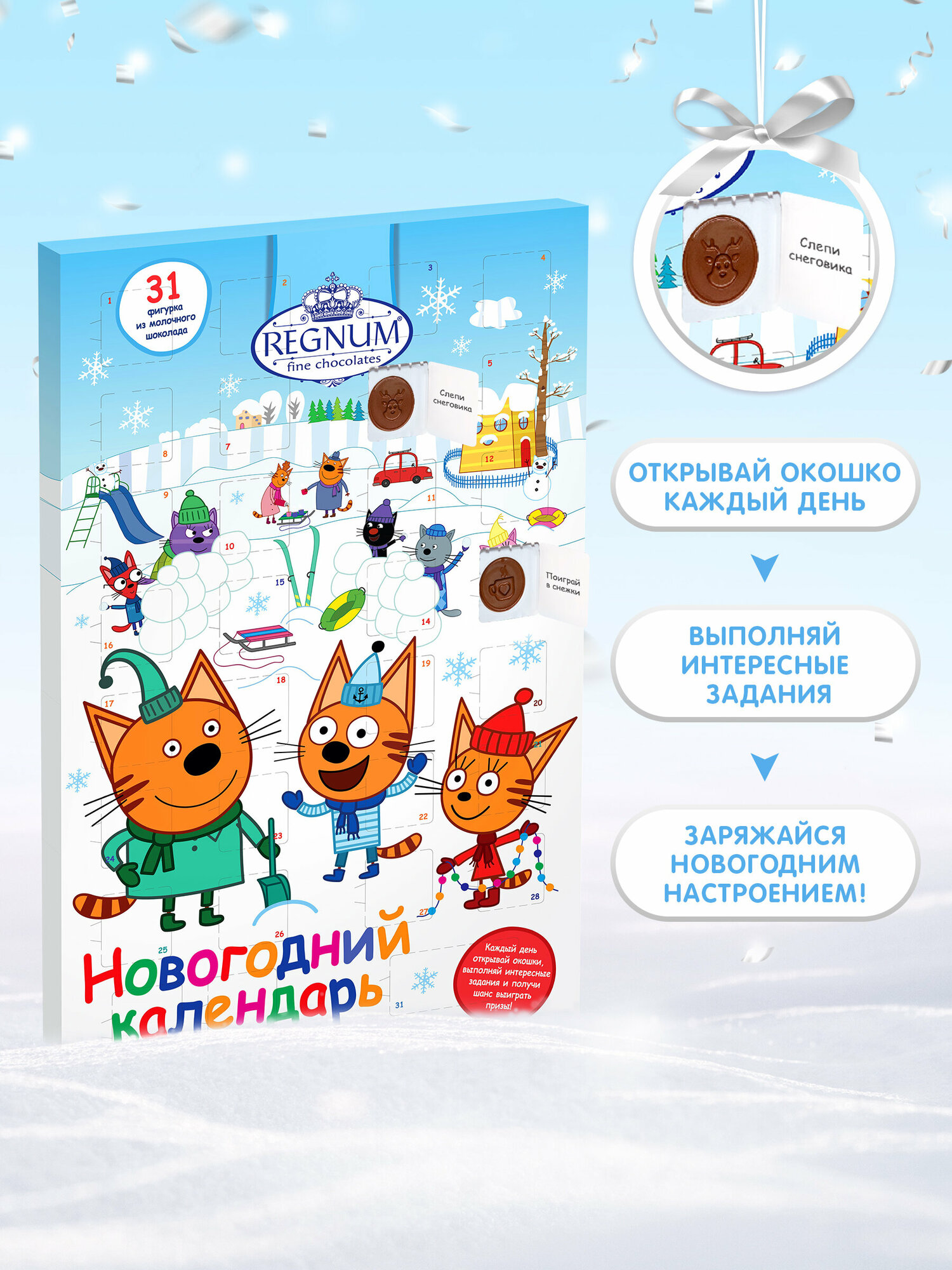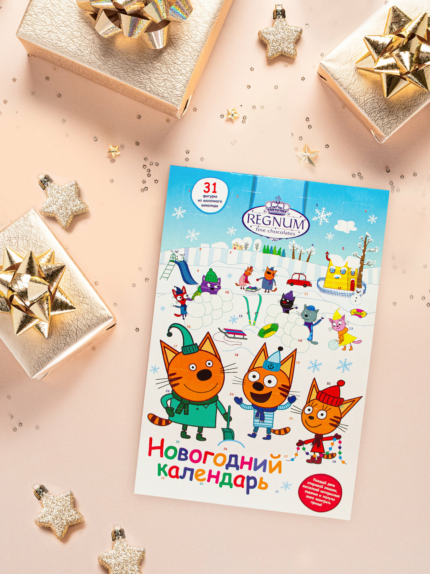 Приближается Новый год время, наполненное душевным теплом, улыбками и, конечно же, подарками, о которых стоит задуматься уже сегодня. Предлагаем вам порадовать своего малыша и подарить ему адвент-календарь Regnum Три кота, чтобы ребёнок сам отсчитывал время, оставшееся до Нового года. Продукт представляет собой красочную коробку в виде большой открытки с изображением главных героев из мультсериала. Календарь имеет 31 окошко по количеству дней в декабре. Под каждым из них малыш найдёт шоколадную фигурку и интересное новогоднее задание.
