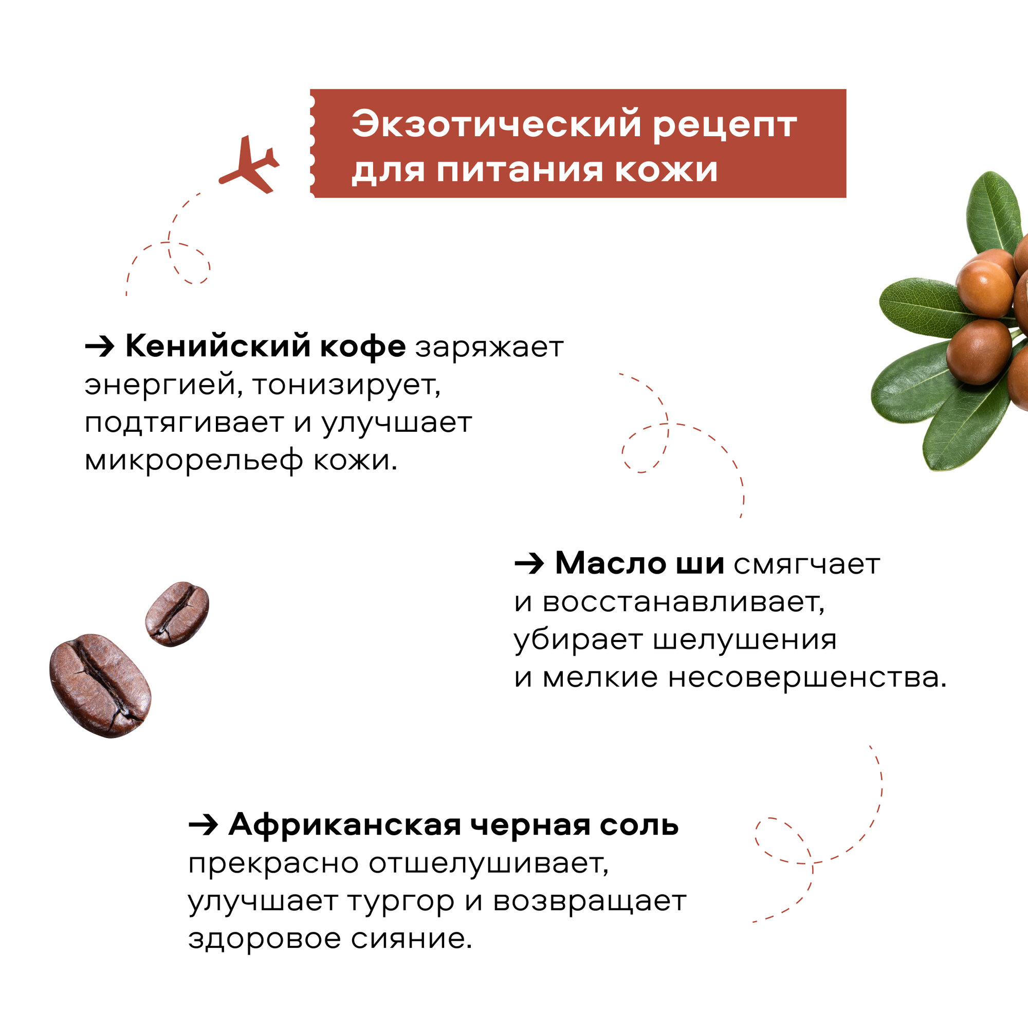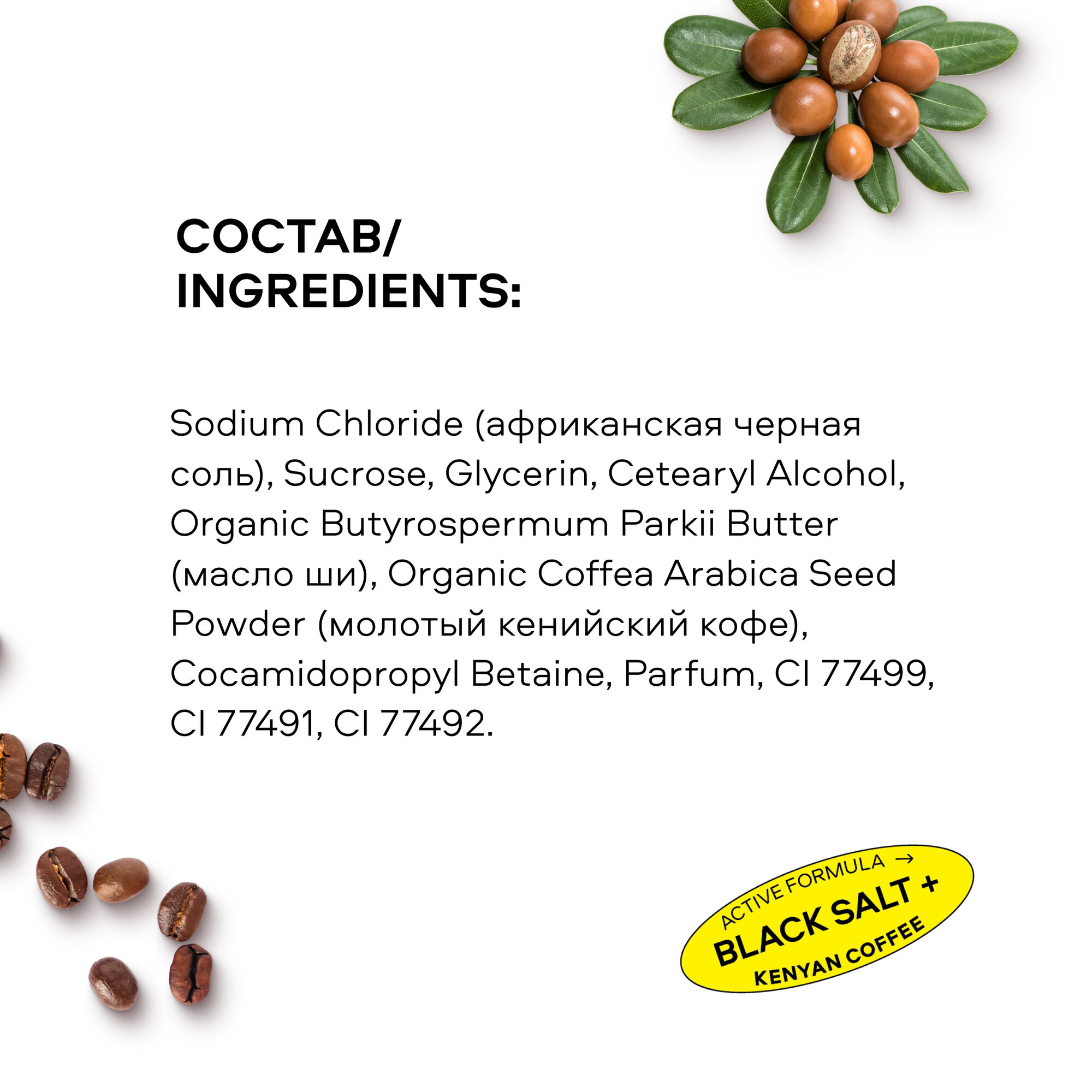 ОЧИЩАЮЩИЙ КОФЕЙНЫЙ СКРАБ ДЛЯ ТЕЛА с ярким заряжающим ароматом и роскошной текстурой прекрасно отшелушивает кожу, подтягивает и делает её невероятно гладкой. КЕНИЙСКИЙ КОФЕ радует моментальным результатом питание, подтянутость и ровный цвет обеспечены. Кофейная ароматерапия расслабляет и одновременно заряжает энергией. МАСЛО ШИ оказывает выраженное смягчающее действие на кожу, устраняет шелушения и мелкие повреждения, придаёт эластичность. АФРИКАНСКАЯ ЧЕРНАЯ СОЛЬ прекрасно отшелушивает, делает рельеф кожи гладким. Придаёт ухоженный и здоровый вид коже.