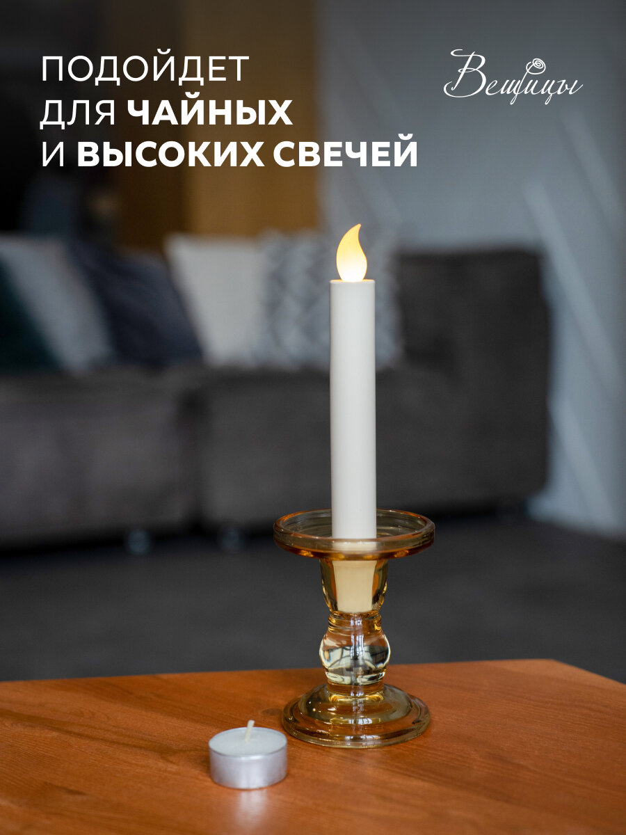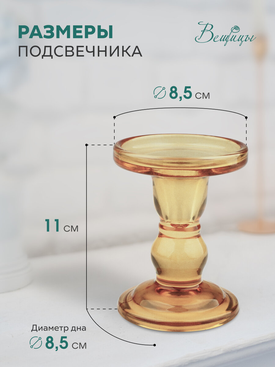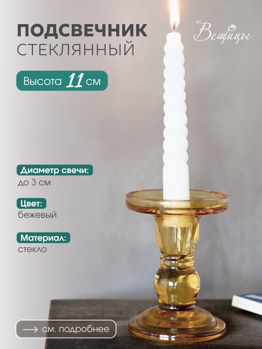 Стеклянный подсвечник "Вещицы" для высоких восковых свечей. Высота 11 см. Широкое основание и прочное стекло позволяют ему устойчиво стоять на столе и надежно удерживать горящую свечу. Блюдце в верхней части соберет воск или парафин, а далее легко отмоется. Подойдет для украшения стола дома, в отеле или ресторане.