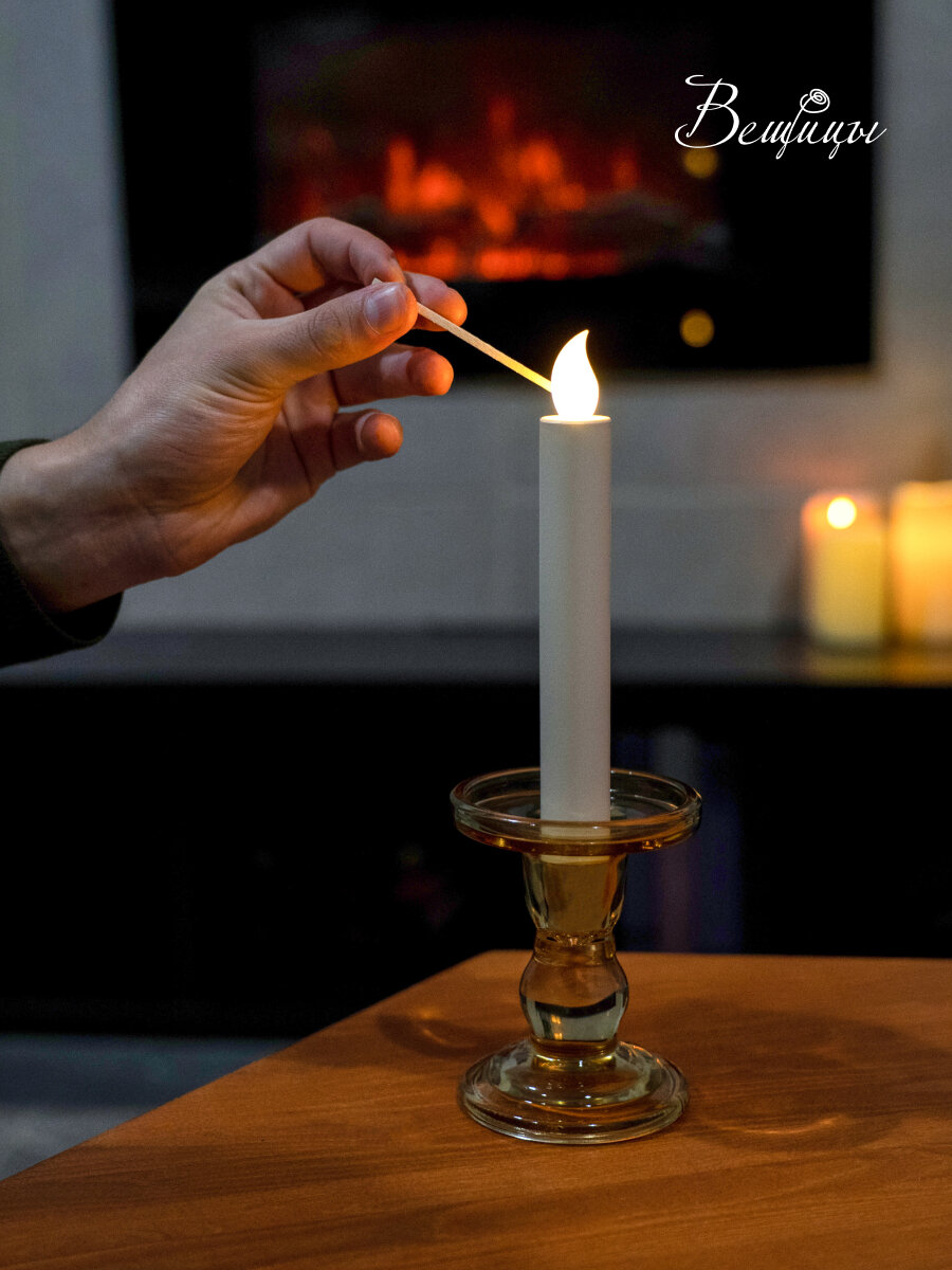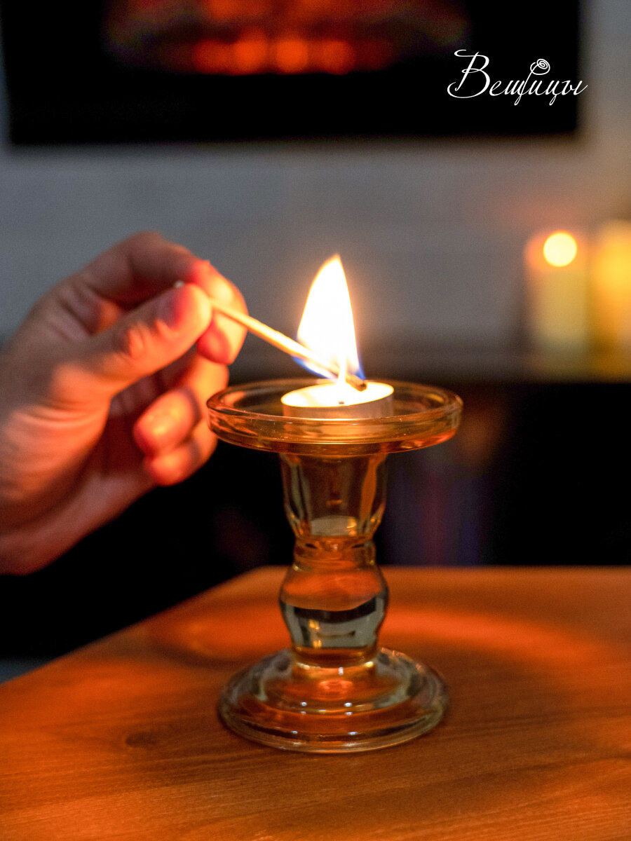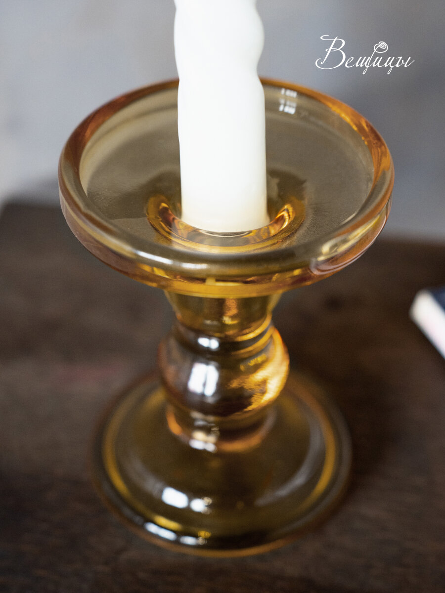 Стеклянный подсвечник "Вещицы" для высоких восковых свечей. Высота 11 см. Широкое основание и прочное стекло позволяют ему устойчиво стоять на столе и надежно удерживать горящую свечу. Блюдце в верхней части соберет воск или парафин, а далее легко отмоется. Подойдет для украшения стола дома, в отеле или ресторане.
