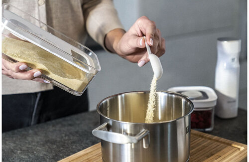 Герметичная крышка контейнера гарантирует свежесть ваших сухих продуктов. Она также образует барьер против влаги и насекомых. Поэтому контейнер CUBE идеально подходит для безопасного хранения ваших продуктов. Инновационная вакуумная технология обеспечивает еще большую свежесть. Для этого поместите вакуумный насос ZWILLING FRESH & SAVE на клапан, нажмите кнопку и подождите несколько секунд: воздух удаляется бесшумно, а вкусы, текстура и питательные вещества сохраняются. Решение для лучшего контроля за вашими продуктовыми запасами - следить за продуктами очень легко благодаря прозрачному пластику контейнера. Это позволяет проверить уровень его наполнения перед походом за покупками.