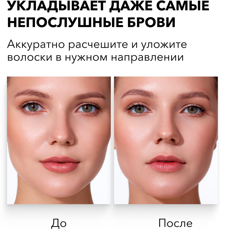 Укладывает и надежно фиксирует даже самые непослушные волоски без склеивания. Нелипкая и невесомая текстура прозрачного геля тонко распределяется, создает аккуратные, ухоженные брови. Удобная конусообразная щеточка набирает оптимальное количество средства и равномерно распределяет его по волоскам. Прозрачный гель можно использовать как самостоятельно, так и в сочетании с любыми декоративными продуктами для макияжа бровей. Пантенол увлажняет и питает брови, придает им блеск и мягкость, активизирует рост волосков.