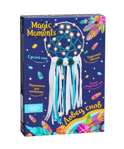 С помощью этого набора вы сможете создать священный амулет индейцев своими руками! Ловцы снов обычно вешают над кроватью спящего. Они ловят плохие сны и пропускают только хорошие. А еще есть поверье, что они оберегают от несчастья. Сделайте этот классический круглый ловец снов приятного бирюзового цвета. В наборе также есть красивая гирлянда с теплым светом, которая сделает атмосферу в комнате ещё уютнее!