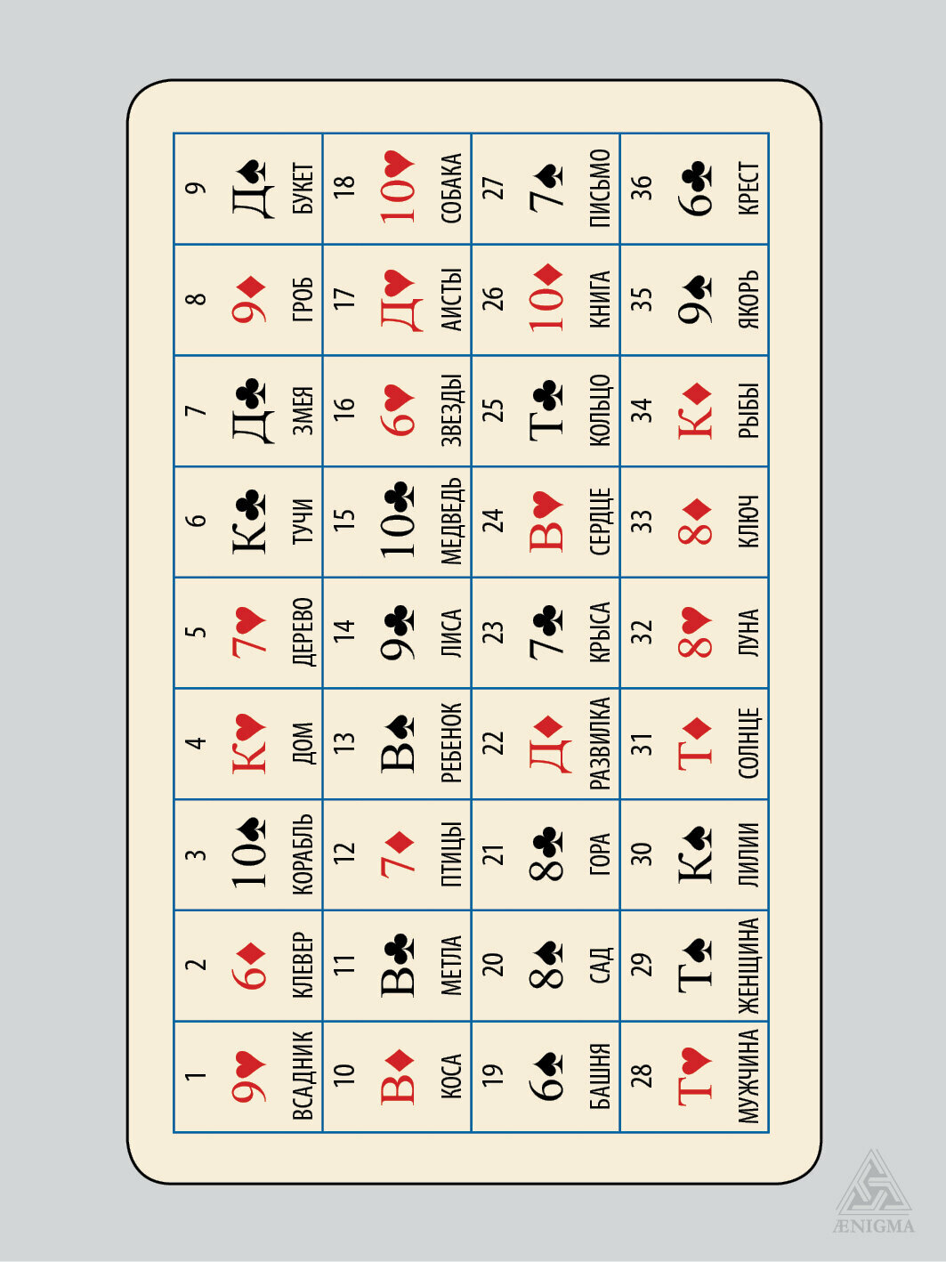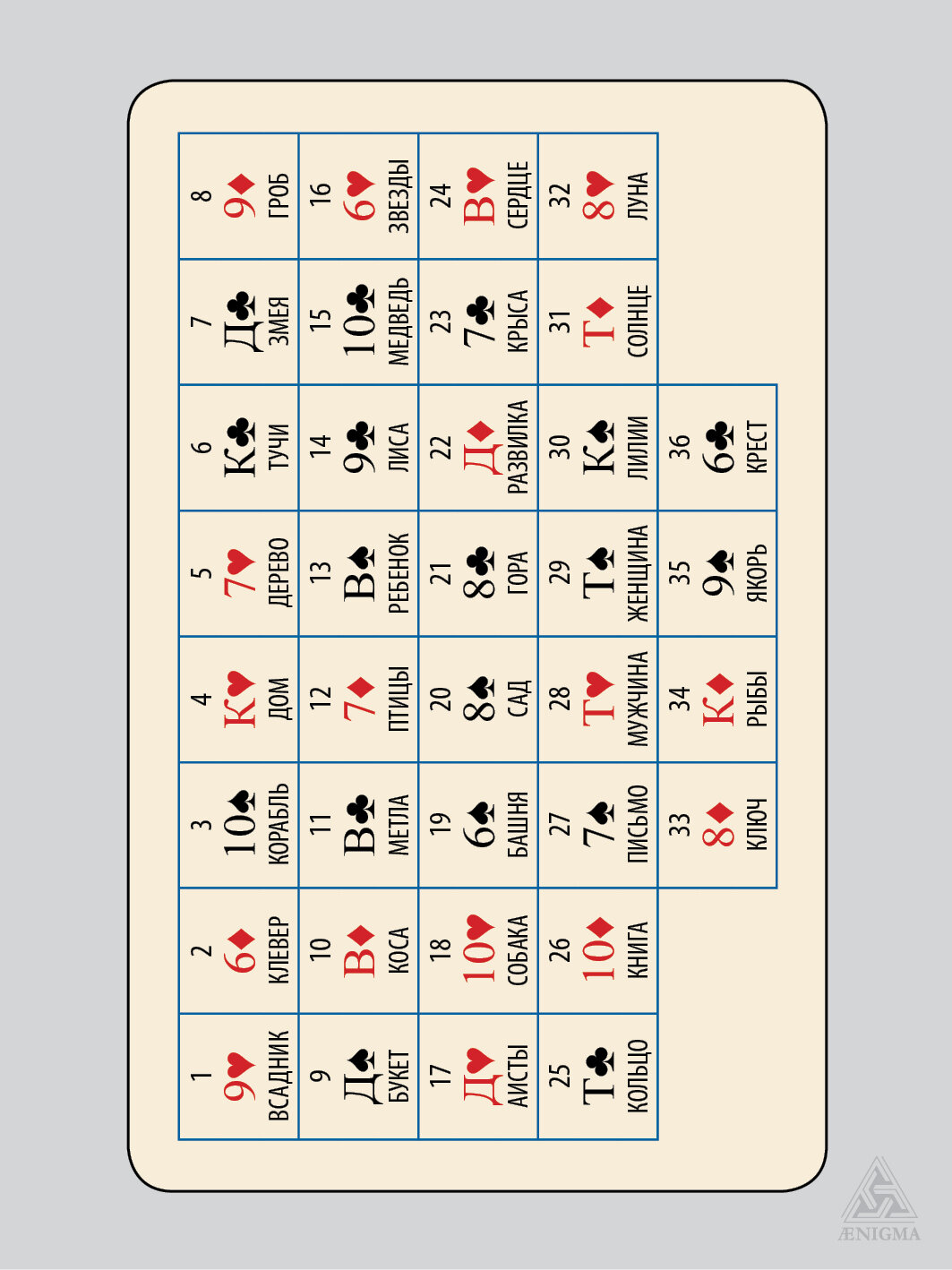В комплекте: 36 карт, 2 сигнификатора, 2 листа подсказок, инструкция на русском языке.