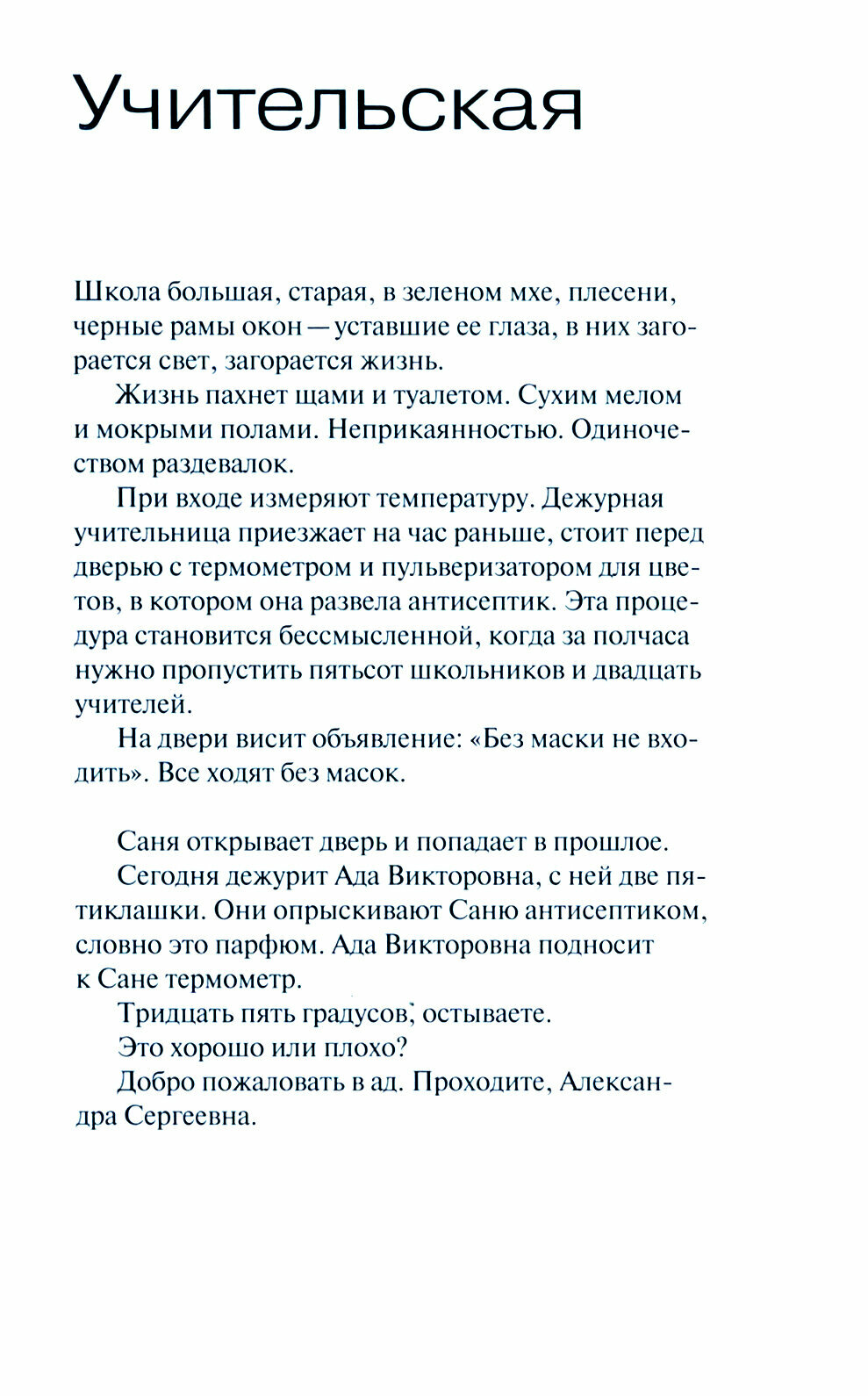 Этот роман - мое счастье. Тихий, но захватывающий page turner об учительском хождении в народ, которое получилось неколониальным и эмпатичным. Мерцающее Светино описание заснеженного вневременного пространства, в котором, как в столовской каше, плавают школа, маршрутки, церковные колокола, учительницы, директриса, дети, родители, горшки с цветами, тетрадки, сигаретные бычки, парты и главная героиня Саня, - портрет страны, в которой мы оказались.