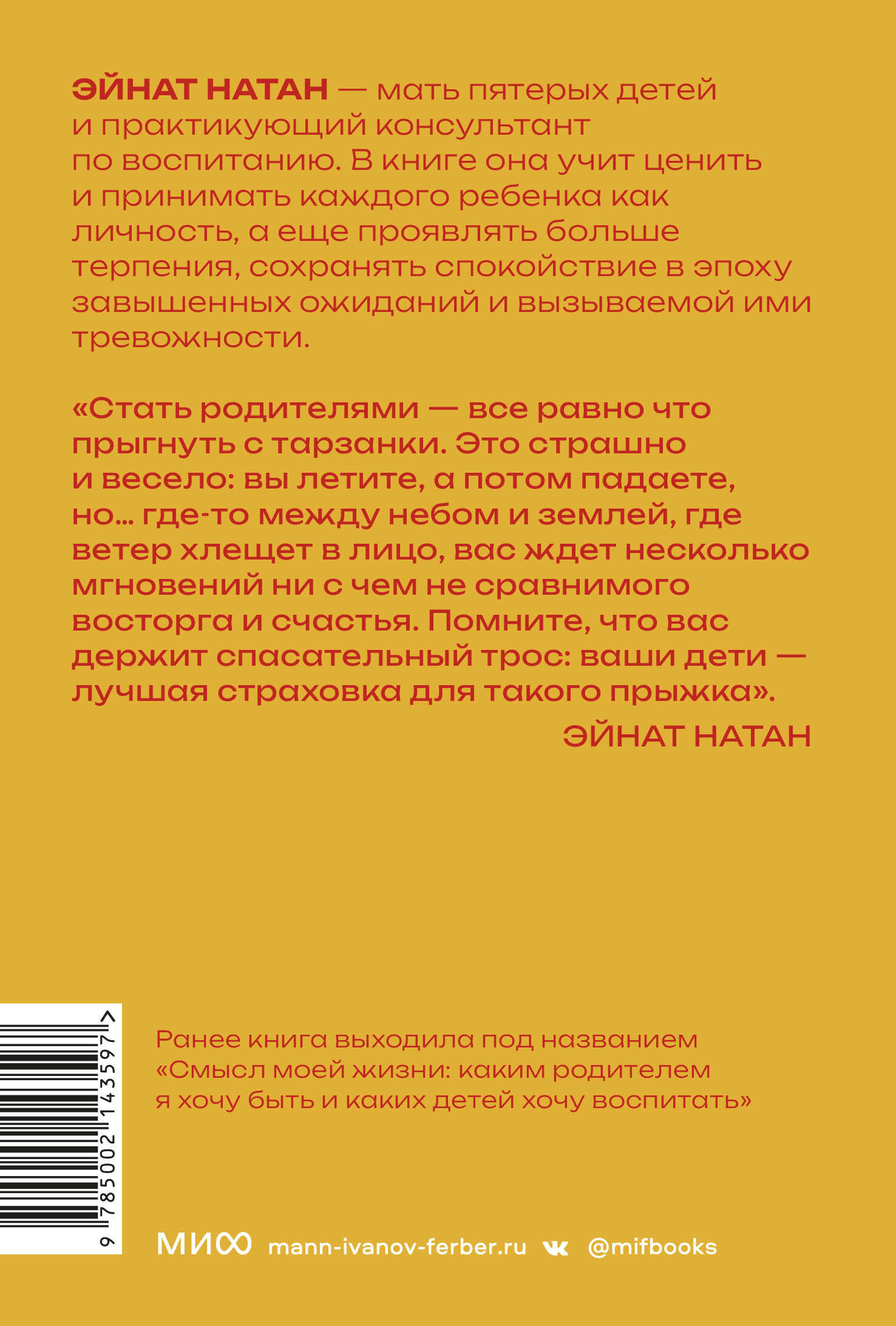 Мудрая, искренняя и добрая книга-поддержка от мамы пятерых детей и консультанта по воспитанию, в которой она делится своим опытом и учит понимать язык детских сердец. Ранее выходила под названием "Смысл моей жизни". Дети появляются не ради того, чтобы осчастливить нас, быть поводом для гордости или потешить наше самолюбие. Наша цель — воспитать их, несмотря на хаос, который они вносят в нашу жизнь, и стать для них достаточно хорошими родителями. Нет, не идеальными, а теми, которые иногда расстраиваются, но умеют и от души повеселиться, слушают своих детей и замечают их потребности, но не забывают и о своих нуждах. Эйнат Натан — мама пятерых детей и практикующий консультант по воспитанию в собственной клинике — не понаслышке знает, какой "самой тяжелой работой в мире — быть родителями" нам приходится заниматься каждый день. В ее книге 50+ родительских тем: как слушать детей и как с ними говорить, как заботиться, но не ограничивать, как реагировать на боль, гнев и слезы. Автор говорит о вопросах, которые тревожат всех родителей: детские истерики, совместный сон, визит аиста, первый класс и школа, сложные подростки, половое воспитание, травля и другие, — но пишет о них в успокаивающей манере. Книга поможет родителям проявлять больше терпения, сохранять спокойствие в эпоху завышенных ожиданий, а еще ценить и принимать каждого ребенка как личность. Для этого не нужны специальные навыки. Важно понимать детей, стараться смотреть на мир их глазами. Эта книга — не только международный бестселлер и гид по воспитанию, но и рука поддержки для родителей на сложном пути, который мы проходим каждый день вместе с ребенком. Фишки книги Реальные истории из жизни мамы пятерых детей. Книга наполнена теплотой и любовью к детям и родителям. Проблемы, знакомые каждому родителю. Не назидательный тон, а разговор на равных. Международный бестселлер, выбор редакции Amazon. Для кого эта книга Для мам и пап, которые хотят понять своих детей, посмотреть на мир их глазами. Для тех, кто планирует стать родителями и хочет исследовать родительский путь. Для каждого родителя, который хочет вырастить счастливого человека. От автора История о том, как мы становимся родителями, какие мы родители сейчас и какими родителями будем спустя годы, переписывается ежедневно и ежесекундно. Эта история повествует о том, как мы влюбляемся и любим, как общаемся и выражаем свое "я", о страхе и трудностях, о старой боли, уже позабытой нами, и о боли новой, возникающей на нашем пути. О храбрости и скромности, о несовершенстве, о гармонии и о ее отсутствии. Но самое главное — в этой истории всегда будет несколько рассказчиков и разные точки зрения. Тысячи проведенных с родителями встреч, личный опыт и накопленные профессиональные знания позволили мне рассказать о сложной истории воспитания детей так, как вижу ее я. Уроки, которые мои дети преподносят мне, я записываю в историю своей жизни. С этими уроками я познакомлю вас в своей книге, поскольку убеждена, что именно так нужно говорить о родительстве в наши дни.