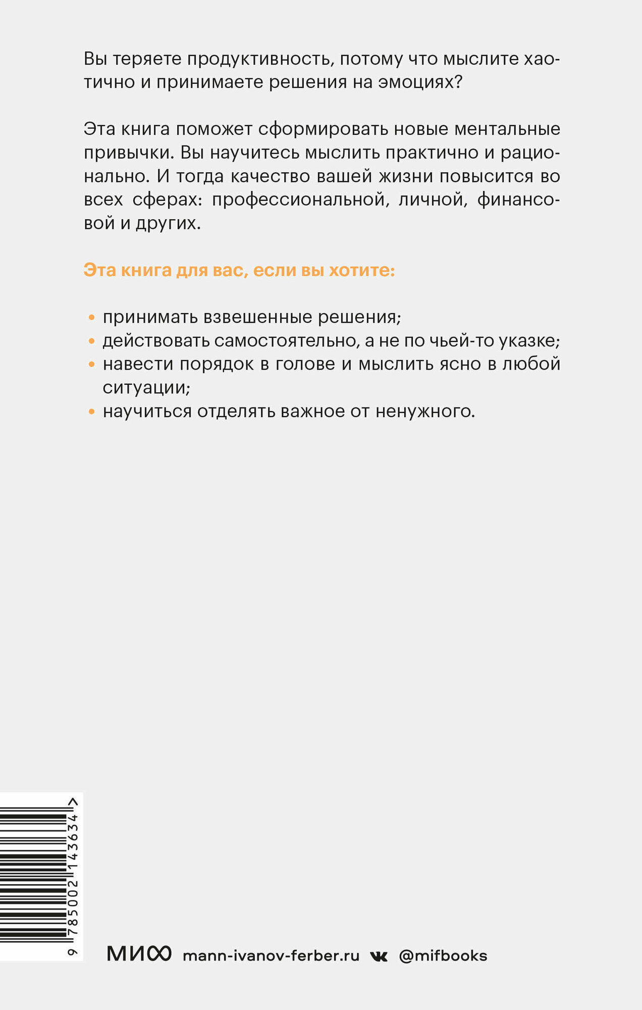 Эта книга поможет сформировать новые ментальные привычки. Вы научитесь мыслить практично и рационально. И тогда качество вашей жизни повысится во всех сферах: профессиональной, личной, финансовой и других.