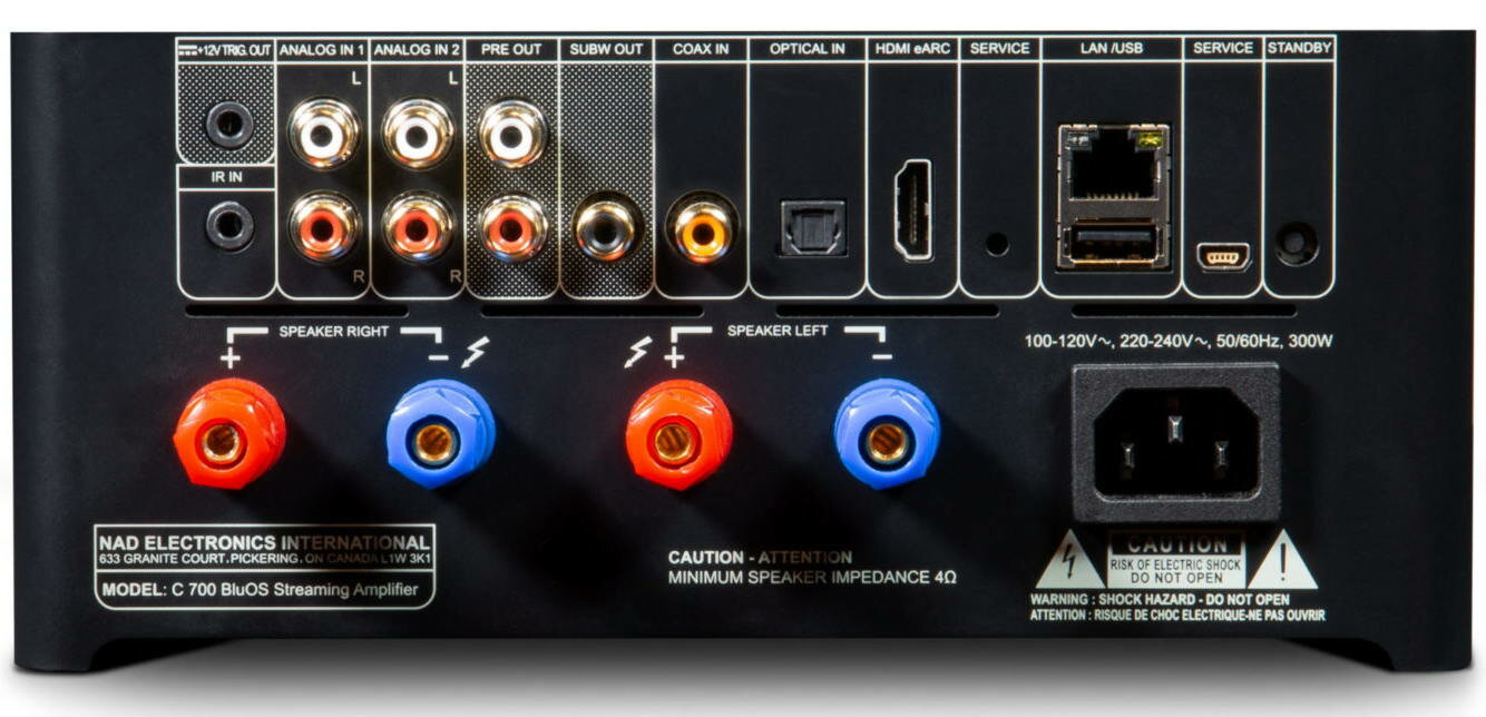 NAD имеет две пары аналоговых входов RCA, а также коаксиальный и оптический цифровые входы, также присутствует Phono вход для подключения проигрывателей виниловых дисков. Также есть порт HDMI eARC для подключения HDTV с поддержкой HDMI ARC. Это позволяет регулировать громкость усилителя с пульта ДУ телевизора. Двусторонняя связь aptX HD Bluetooth обеспечивает удобный способ прослушивания музыки через беспроводные наушники и потоковую передачу звука с любого совместимого устройства. В дополнение к выходам на динамики аудиофильского уровня, NAD имеет выходной порт для сабвуфера. Удобные настройки кроссовера низких и высоких частот в приложении BluOS обеспечивают плавное сочетание сабвуфера и основных динамиков.