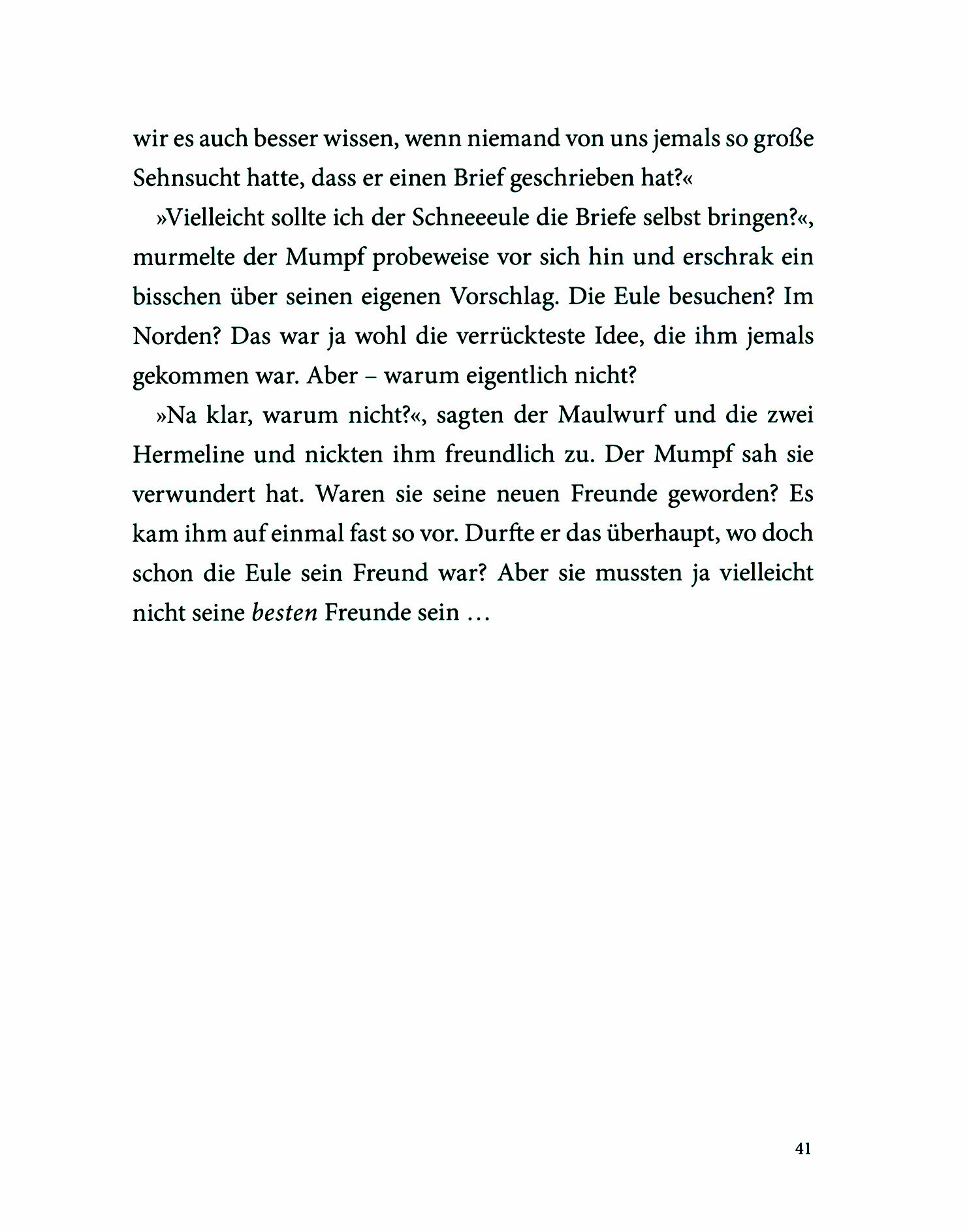 Doch eines Tages entdeckt der Mumpf, dass der selbstgebaute Briefkasten im Wald nie geleert wird. Keinen einzigen Brief hat die Eule von ihm bekommen – muss sie nicht denken, dass er sie vergessen hat? Er beschlie?t, ihr die Briefe selbst zu bringen.