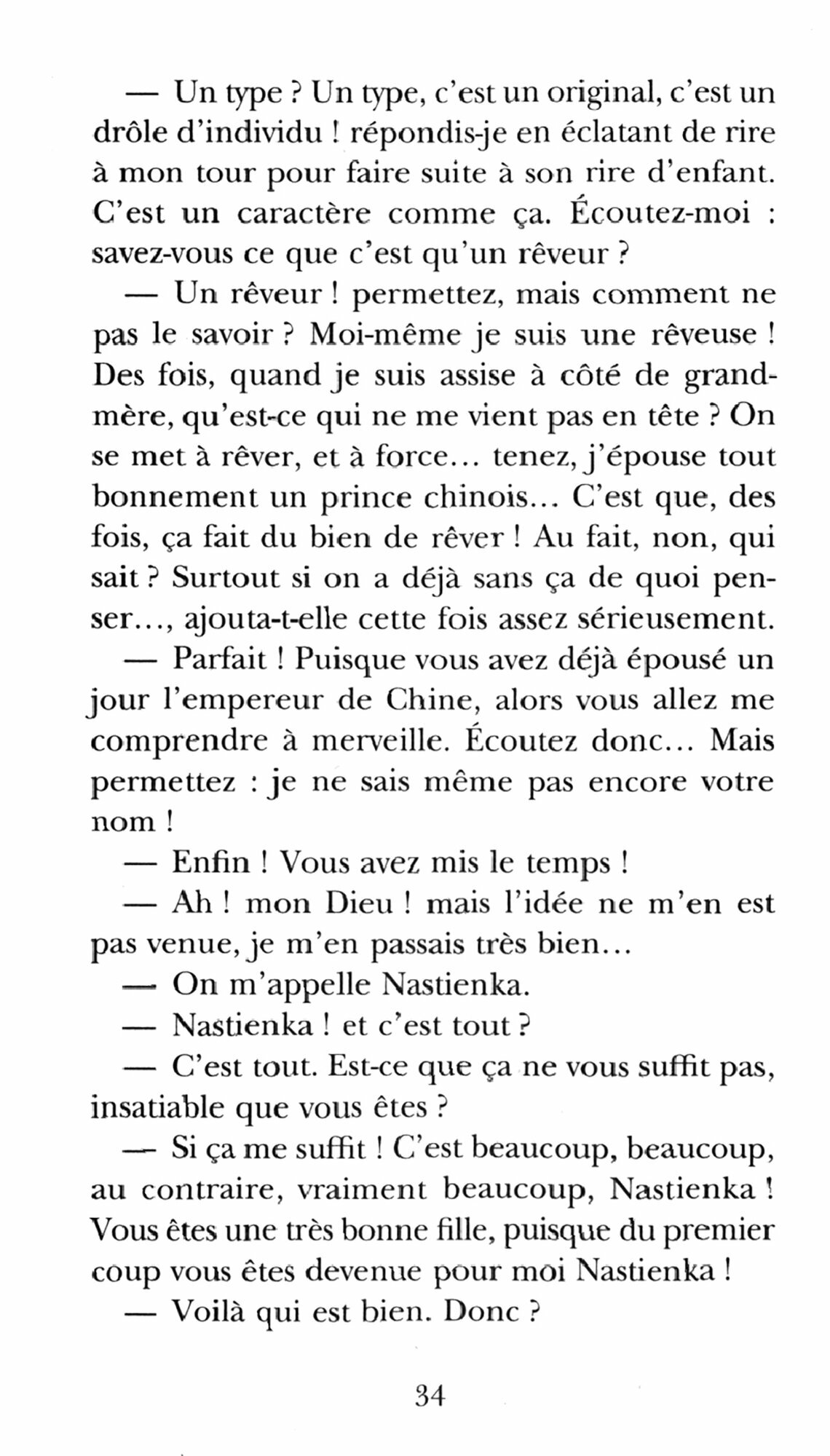 « C’etait une nuit merveilleuse, une de ces nuits comme il n’en peut exister que quand nous sommes jeunes, ami lecteur. Le ciel etait si etoile, un ciel si lumineux, qu’a lever les yeux vers lui on devait malgre soi se demander : se peut-il que sous un pareil ciel vivent toutes sortes d’hommes irrites et capricieux ? Cela aussi, c’est une question jeune, ami lecteur, tres jeune, mais puisse le Seigneur vous l’inspirer souvent !... »