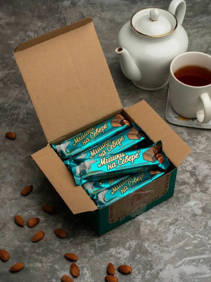 | Состав | Сахар, масло какао, жир растительный (масла растительные, эмульгатор Е322, антиокислители (Е320, Е321)), молоко цельное сухое, какаотертое, мука пшеничная, сыворотка молочная сухая, миндаль, фундук, какао-порошок, заменитель масла какао (масла растительные,эмульгаторы (Е492, лецитин соевый), антиокислитель Е306)), эмульгаторы (лецитин соевый, Е476), меланж сухой, соль, разрыхлительгидрокарбонат натрия, ароматизаторы. Продукт может содержать следы арахиса. Противопоказано при индивидуальной непереносимостияичного белка и белка молока. |