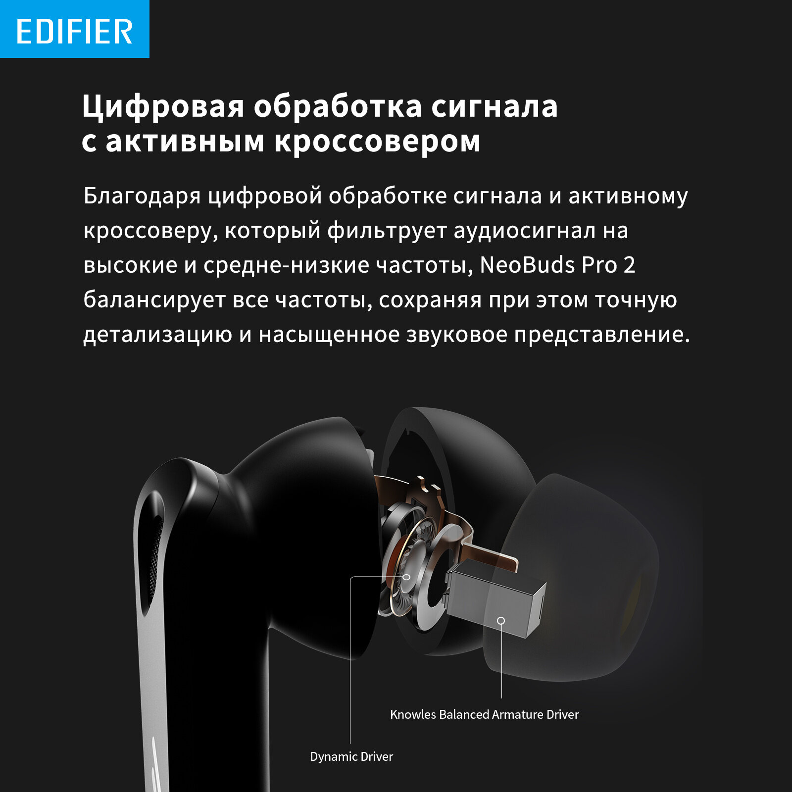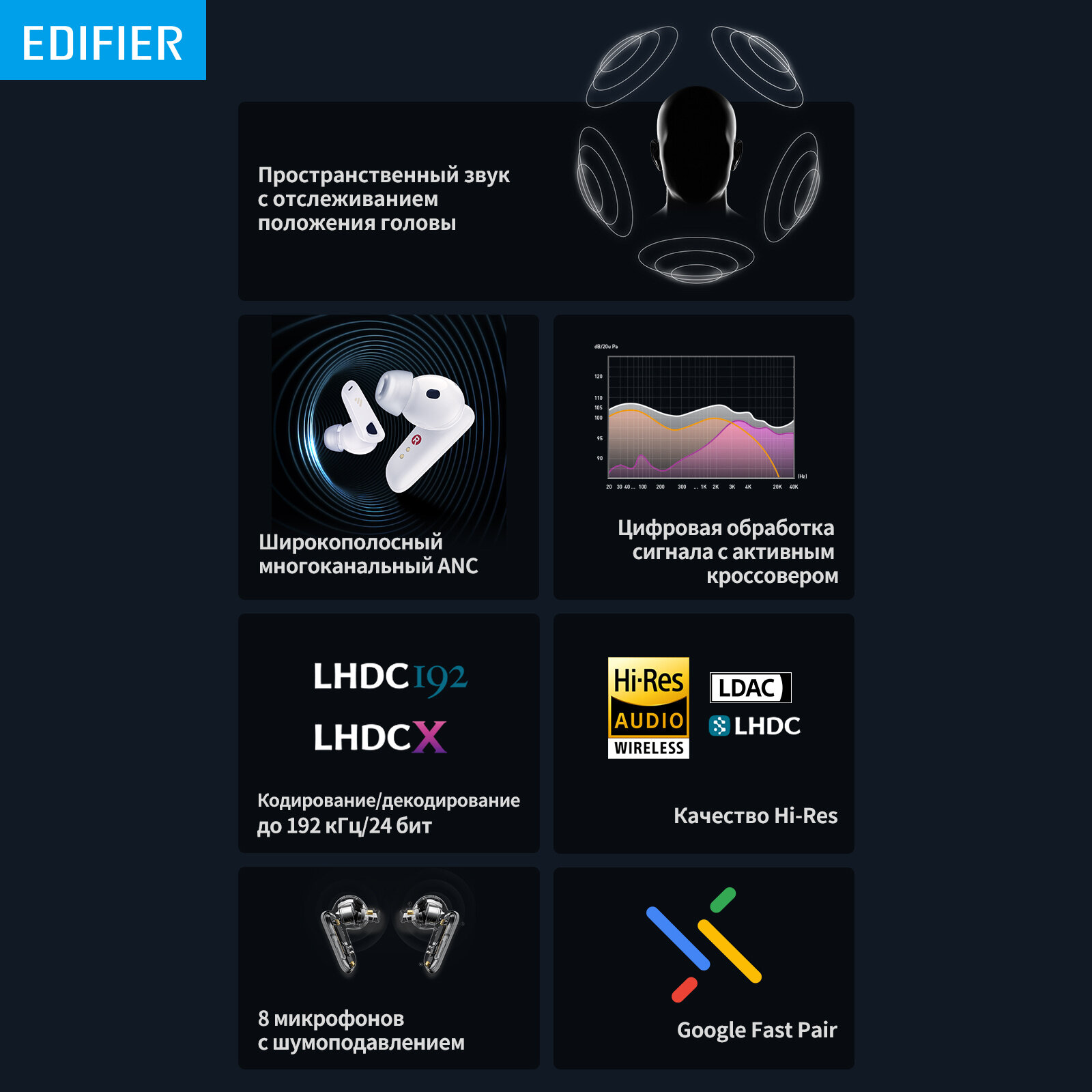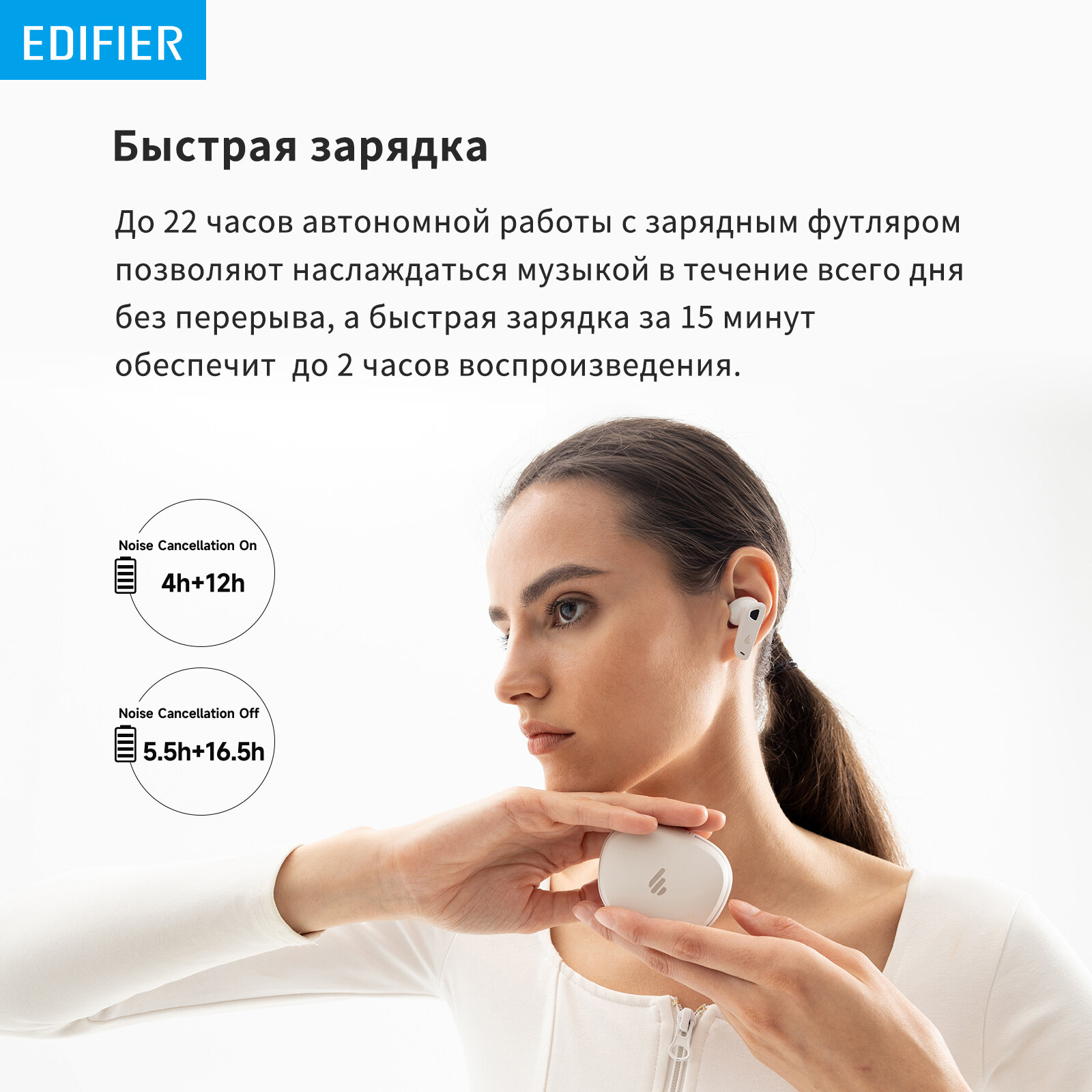 Bluetooth гарнитура Edifier Black.EDIFIER широкополосный многоканальный ANC™Новейшая запатентованная технология Edifier ANC для обеспечения более широкого и глубокого ANC.пространственный аудио 360°Он создает полностью захватывающий звук, окружая вас реалистичным звуком со всех сторон, когда вы двигаетесь.сертификация звука HI-RES И LDACСбалансированный арматурный драйвер Knowles и многодиафрагменные динамические драйверы с перекрестным управлением Electronics.лучшее качество звукаПринимайте идеальные звонки с помощью алгоритма формирования луча 4+4 микрофонов.