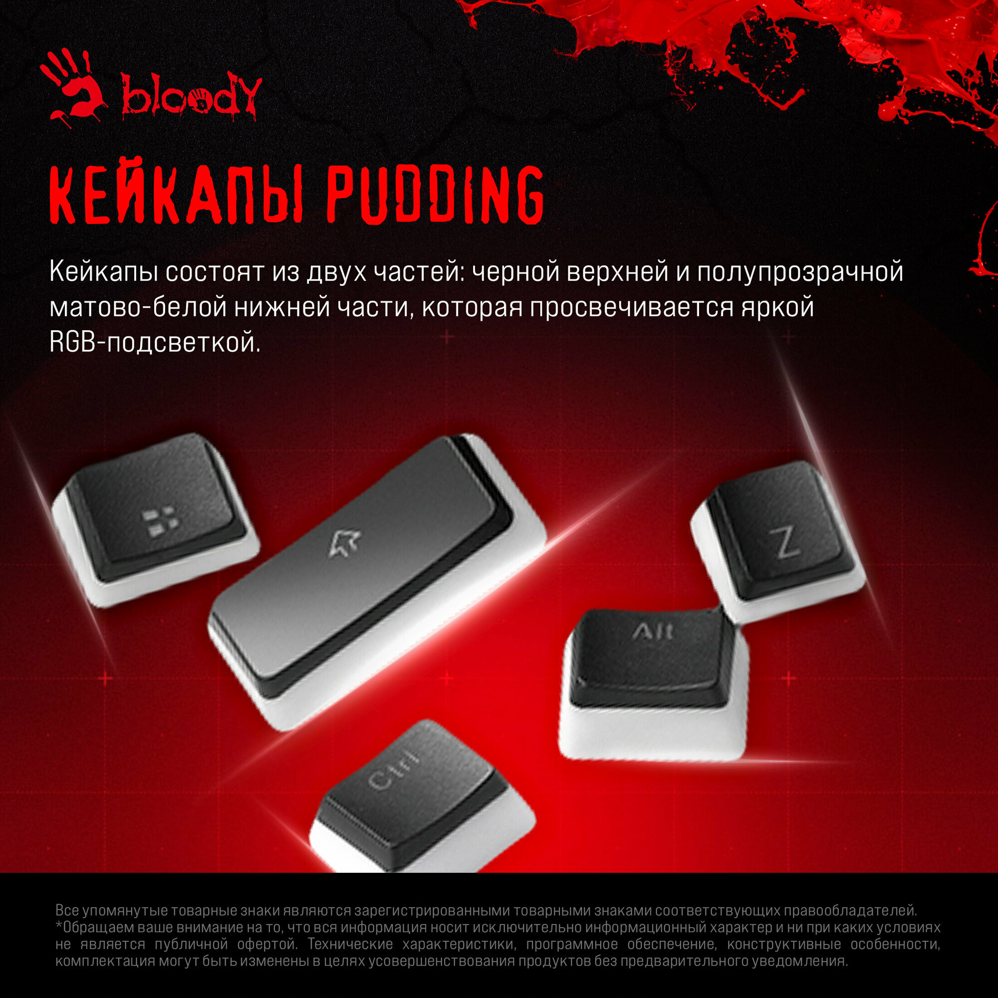 Кейкапы состоят из двух частей: черной верхней и полупрозрачной матово-белой нижней части, которая просвечивается яркой RGB подсветкой.