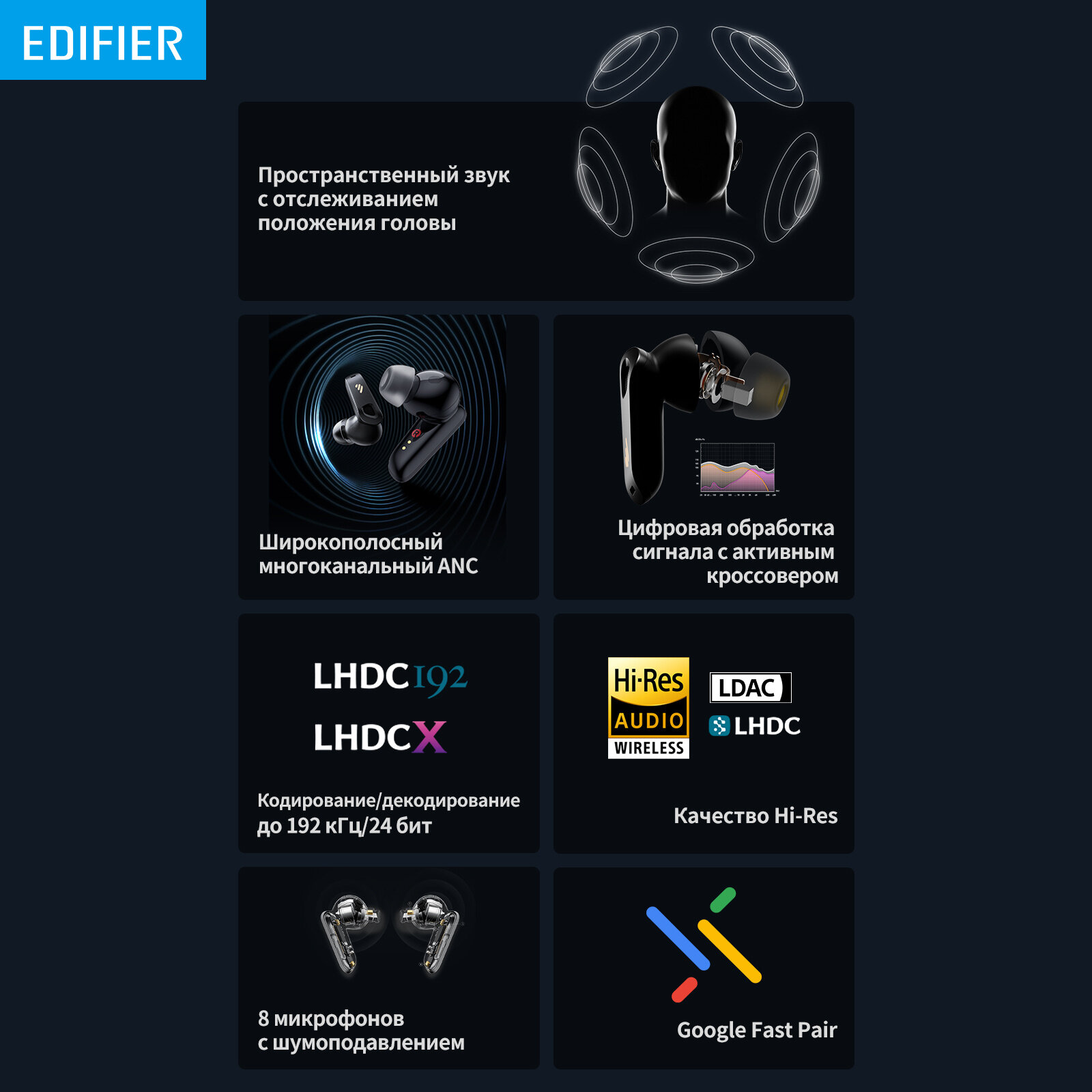 • Усовершенствованный широкополосный многоканальный ANC: Hовейшая запатентованная технология ANC от Edifier обеспечивает более глубокое шумоподавление, увеличивая глубину шумоподавления до впечатляющих -50 дБ и расширяя полосу шумоподавления до 5 кГц. Выберите один из пяти режимов шумоподавления в соответствии с вашими предпочтениями. • Пространственное аудио 360° с отслеживанием положения головы: Наслаждайтесь звуком как никогда раньше благодаря технологии отслеживания положения головы в реальном времени, которая погружает вас в реалистичный трехмерный звуковой ландшафт. NeoBuds Pro 2 точно отслеживают движения вашей головы, окутывая вас звуком, который динамически подстраивается под ваши движения, создавая по-настоящему захватывающее впечатление от прослушивания. • Звук высокого разрешения с LDAC, LHDC и AAC: Благодаря сочетанию сбалансированного якоря Knowles и 10-миллиметровых динамических драйверов NeoBuds Pro 2 обеспечивают мощные басы, четкие средние и искрящиеся высокие тона. Поддержка аудиокодеков LHDC, LDAC и AAC гарантирует, что вы услышите каждый нюанс в исключительных деталях. • Чистые звонки с поддержкой искусственного интеллекта благодаря 8 микрофонам: Оснащенные 4+4 встроенными микрофонами и передовыми алгоритмами искусственного интеллекта, NeoBuds Pro 2 эффективно устраняют шум окружающей среды и ветра, повышая чистоту голоса во время разговора. Наслаждайтесь кристально чистыми телефонными разговорами независимо от окружающей обстановки. • Индивидуальный контроль: Настройте эквалайзер, параметры управления и попробуйте выбрать до 8 цветов светодиодов. Создайте персональный звуковой профиль, который будет уникальным для вас. • Длительный комфорт для ношения в течение всего дня: Эргономичные наушники NeoBuds Pro 2, созданные для комфорта, оснащены семью парами насадок, которые подходят для разных размеров ушного канала. Правильная посадка обеспечивает мощный эффект шумоподавления и длительное комфортное ношение.