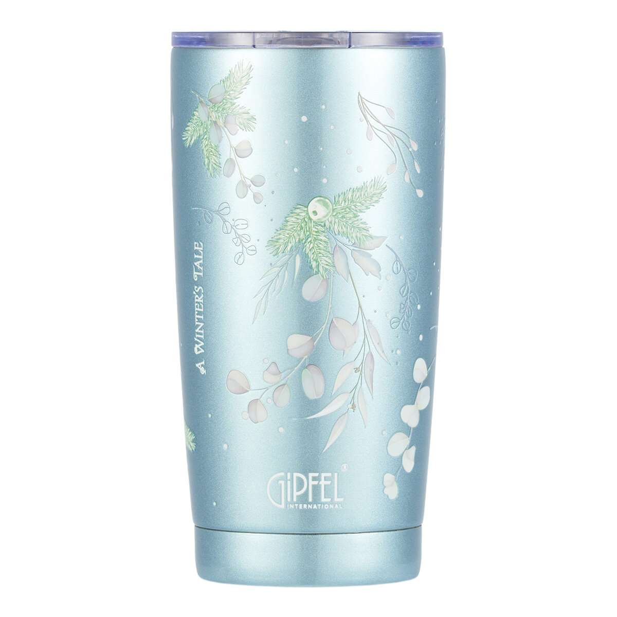 У стакана праздничный новогодний дизайн. Он выполнен в мятно-зеленом цвете и декорирован рисунком из белых снежинок и веточек, с надписью "A winter tale" и логотипом Gipfel.