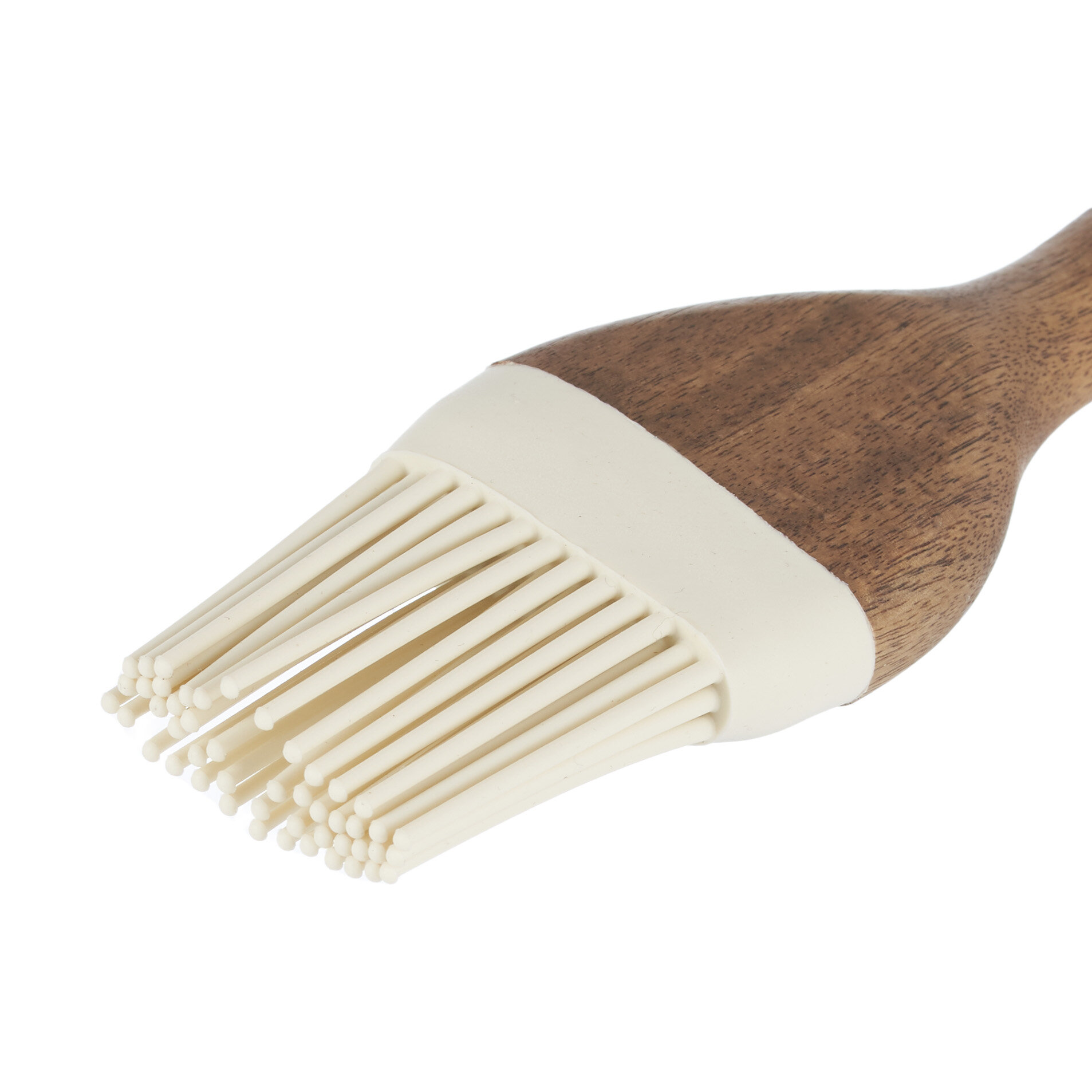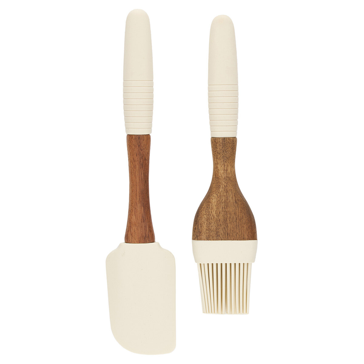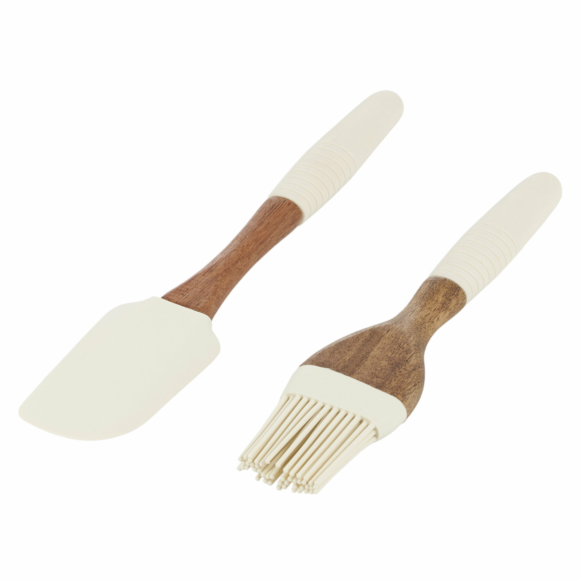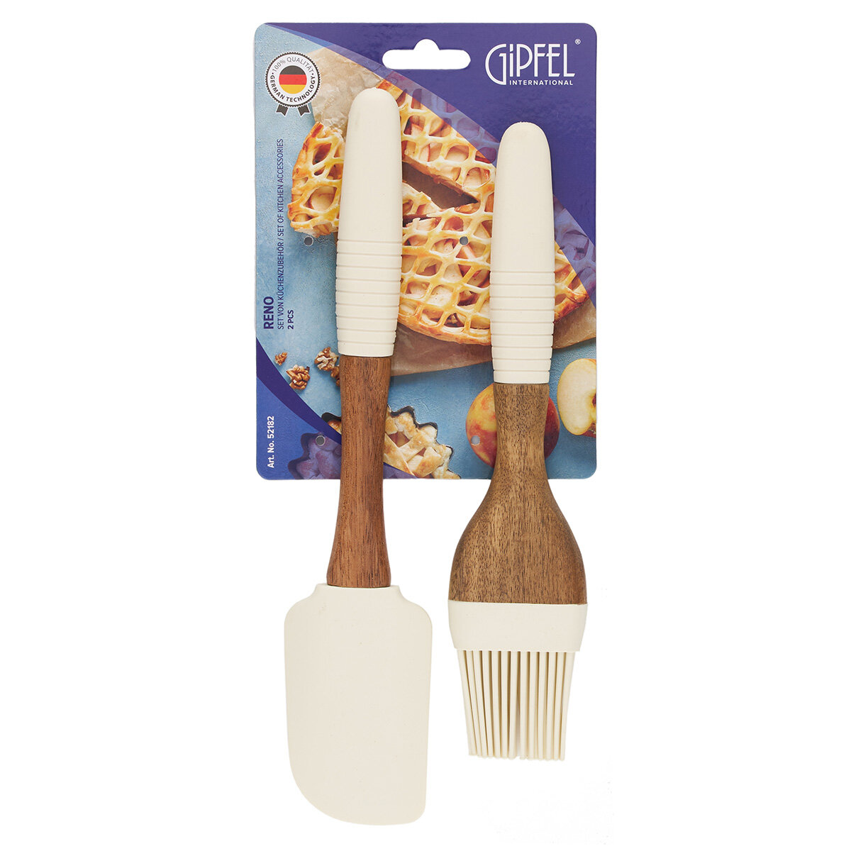 Набор кухонных аксессуаров Gipfel Reno 52182 состоит из двух предметов: лопатка 25 см и кисточка 22 см. Изготовлены из натурального дерева акации и высококачественного пищевого силикона.