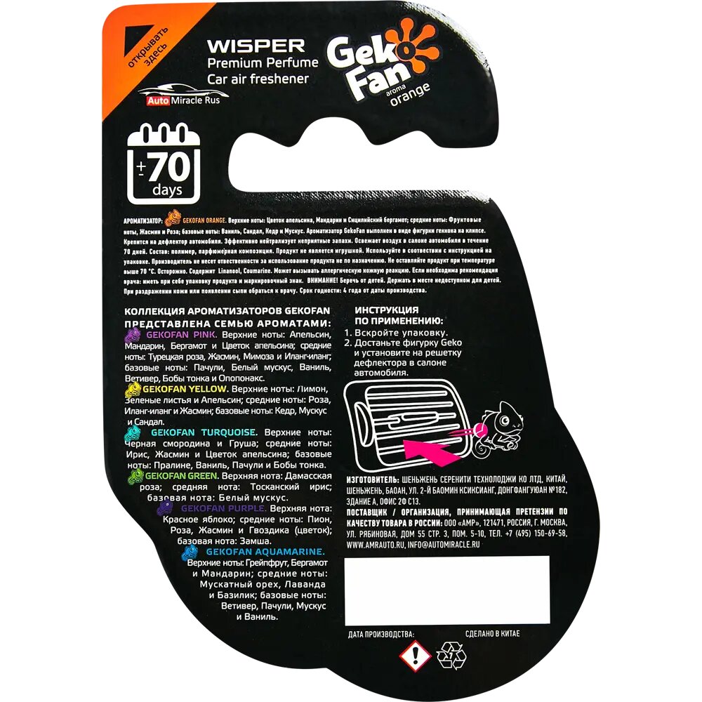 **Ароматизатор Wisper Gekofan Orange** источает бодрящий и эффектный аромат, который заряд энергией, что особенно актуально во время длительных поездок. Средство позволяет нейтрализовать и минимизировать воздействие неприятных запахов. Установка производится на дефлектор. Оболочка выполнена из приятного на ощупь эко-полимера, за счет чего ее можно крутить в руках, сжимать, гнуть.